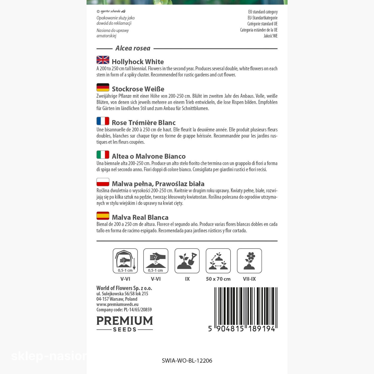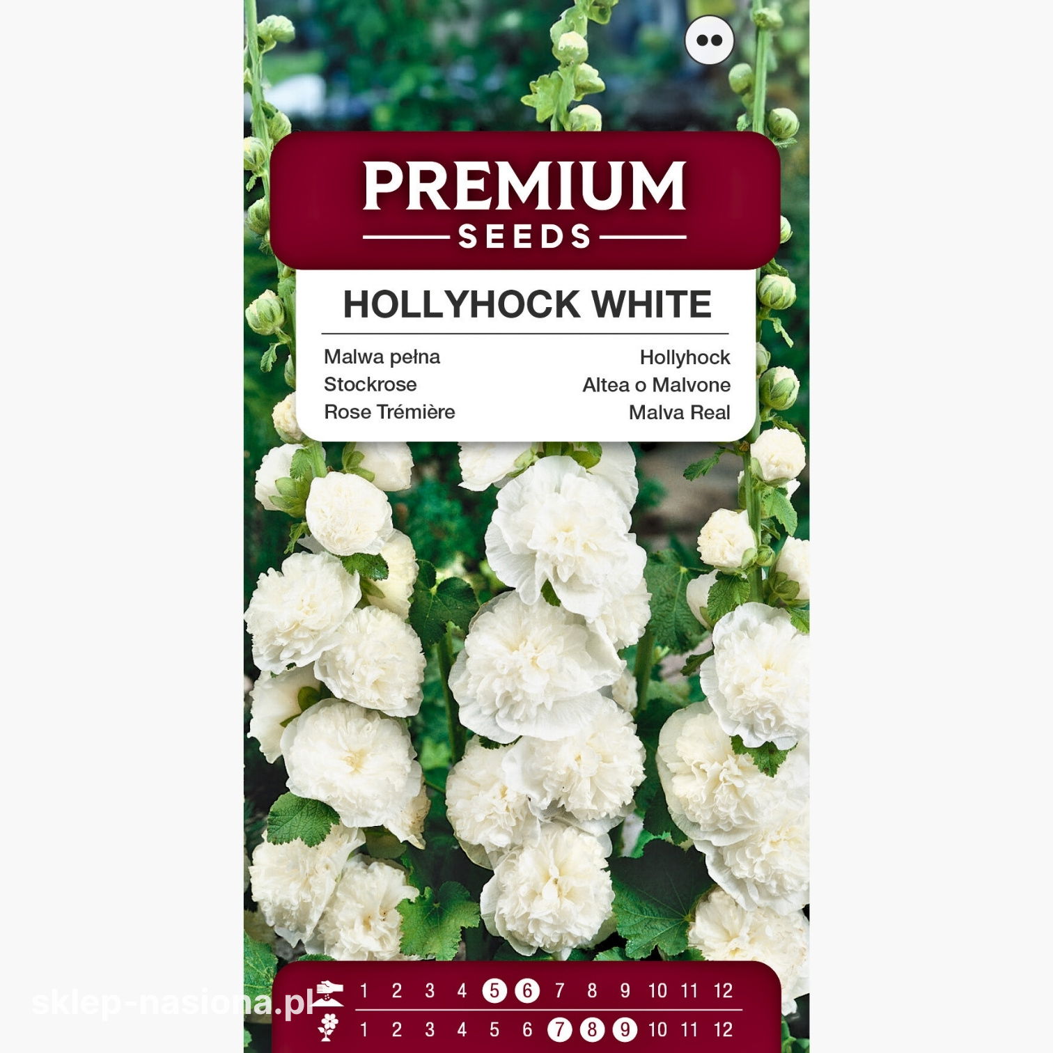 Opakowanie zawiera 0,5 g nasion. Na jego tyle zamieszczono wskazówki dotyczące sposobu uprawy i pielęgnacji malwy oraz informację o terminie przydatności do siewu. Nasiona dostępne w sprzedaży w naszym sklepie internetowym charakteryzują się wysoką jakością.