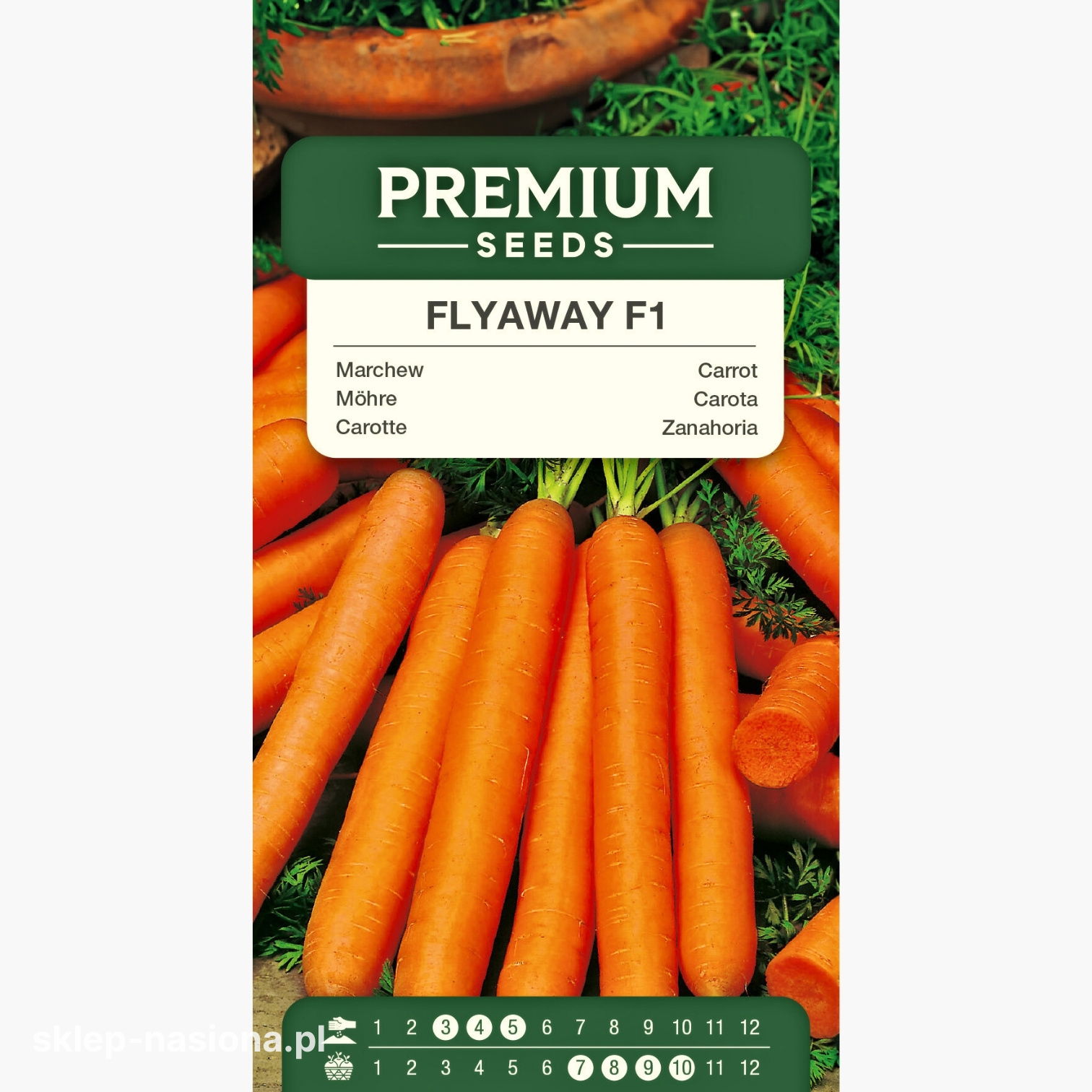 Opakowanie zawiera 450 sztuk nasion marchwi Flyaway F1, informacje na temat daty przydatności do siewu oraz zasad dalszej uprawy.