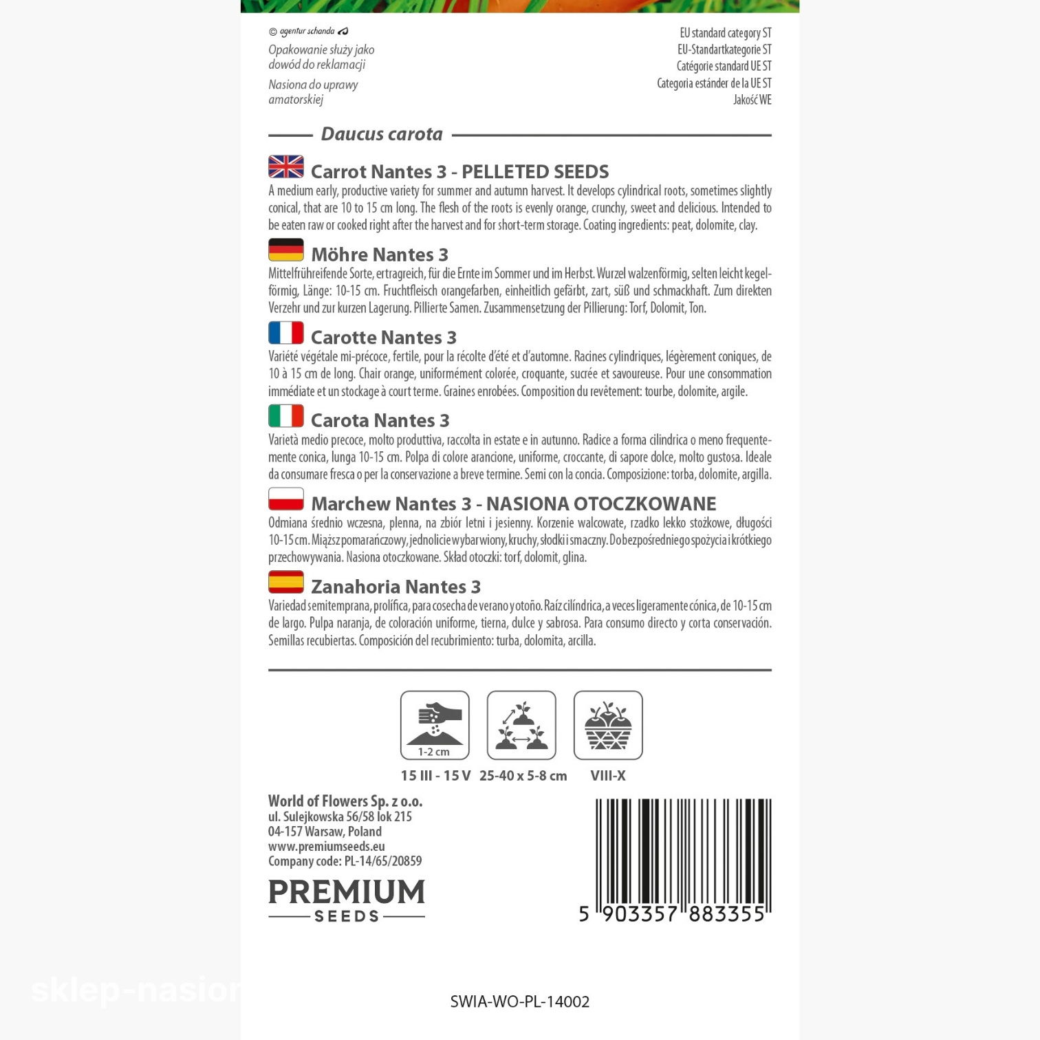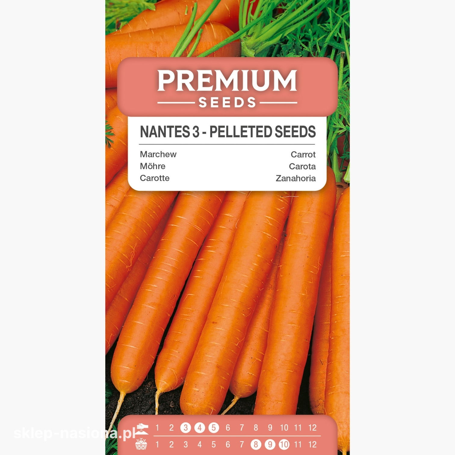 Opakowanie zawiera 400 sztuk nasion marchwi Nantes 3 (Nantejskiej) w postaci otoczkowanej, informacje dotyczące jej uprawy oraz termin przydatności do siewu.