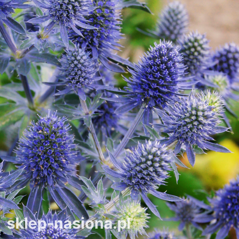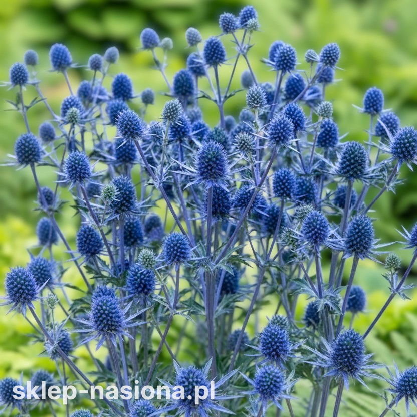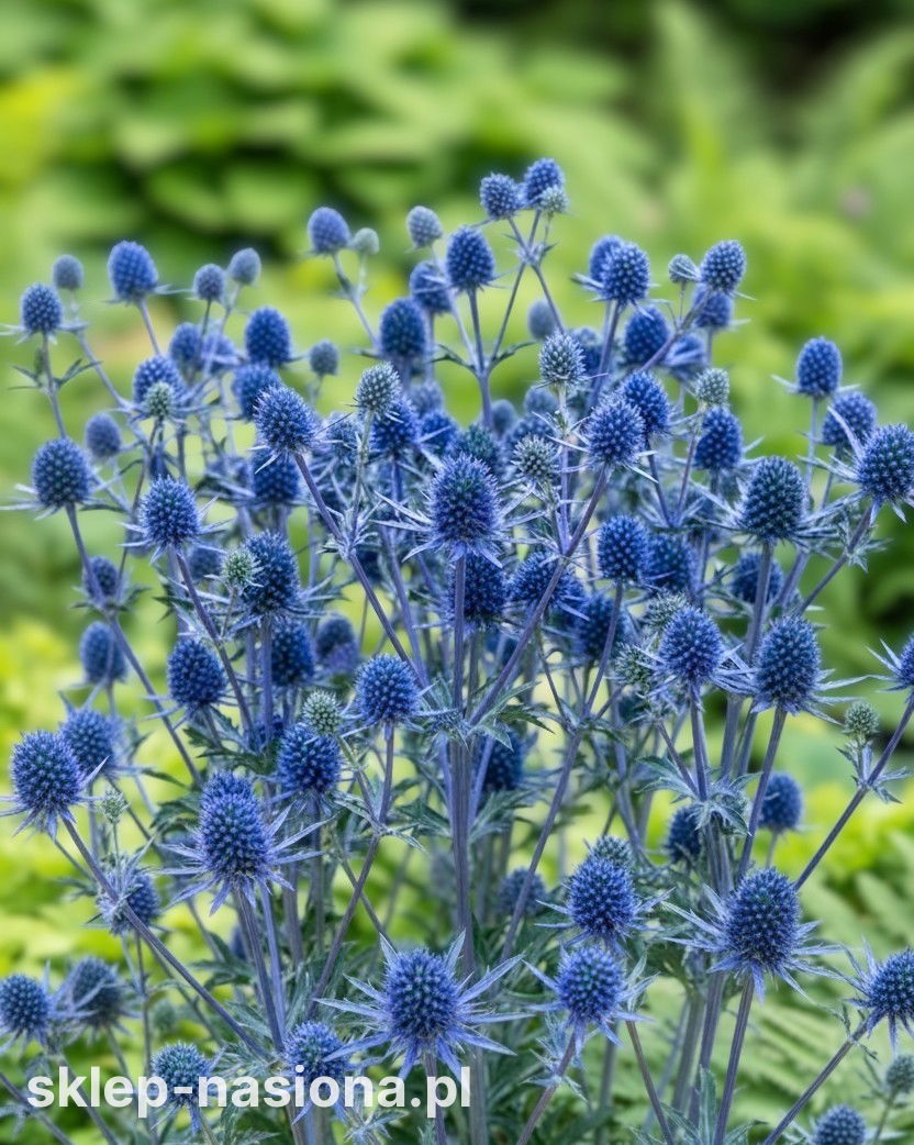 Rodzaj i kolor kwiatów: Kuliste, drobne kwiatostany w odcieniu srebrzysto-niebieskim – trwałe, zachowują kolor po ścięciu