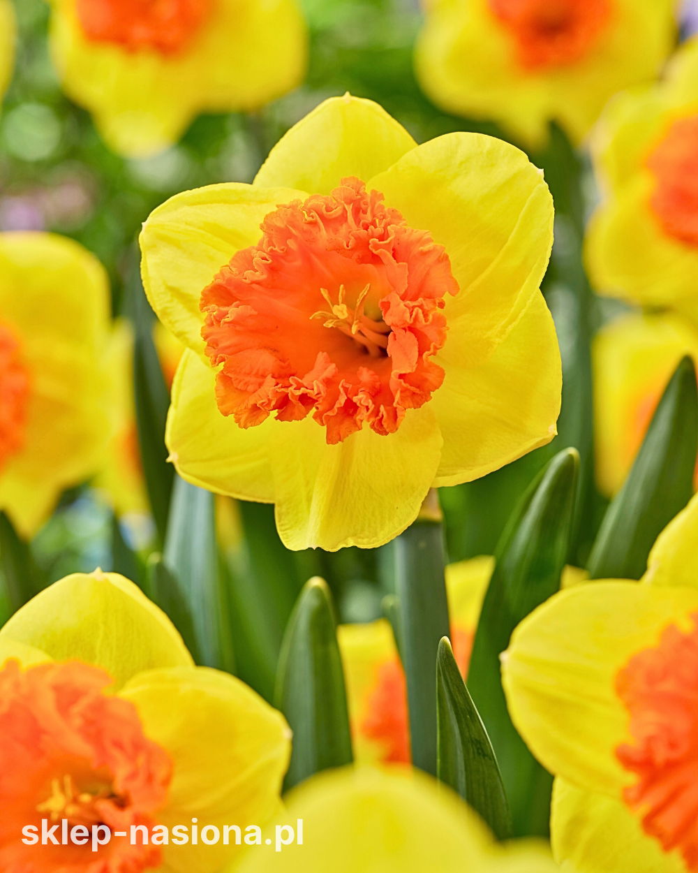 Rodzaj i kolor kwiatów: Duże, jaskrawe kwiaty z żółtymi płatkami i efektownymi, pomarańczowymi, marszczonymi przykoronkami