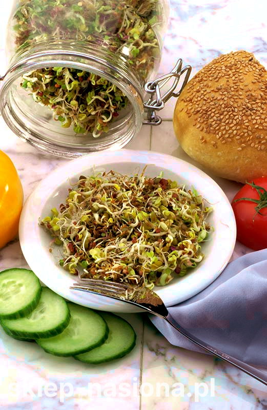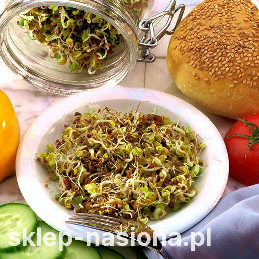 Zastosowanie: Mieszanka oferowana w naszym sklepie jest produktem skomponowanym z najwyższej klasy materiału siewnego, wolnego od pestycydów i dodatków chemicznych. Nasiona umożliwiają wyhodowanie znakomitej jakości, zdrowych kiełków do codziennych posiłków. Mieszanka charakteryzuje się działaniem dodającym witalności i energii. Wpływa wzmacniająco na ogólny stan organizmu. Rewelacyjnie działa na układ krążenia. Stymuluje do pracy układ trawienny. Dodatkowo miks kiełków pomaga w odtruciu organizmu i odkładaniu się frakcji cholesterolu LDL.