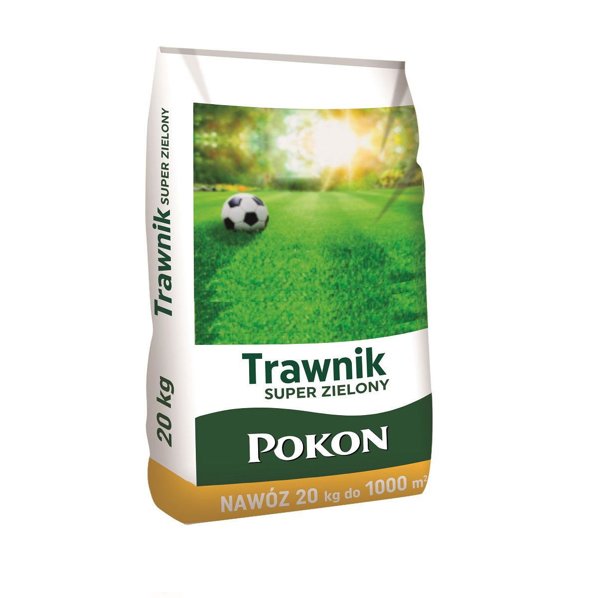 W opakowaniu znajduje się 20 kg nawozu do trawników 'Super Zielony Trawnik' - Pokon. Opakowanie zawiera informację o sposobie stosowania oraz termin przydatności do użycia.