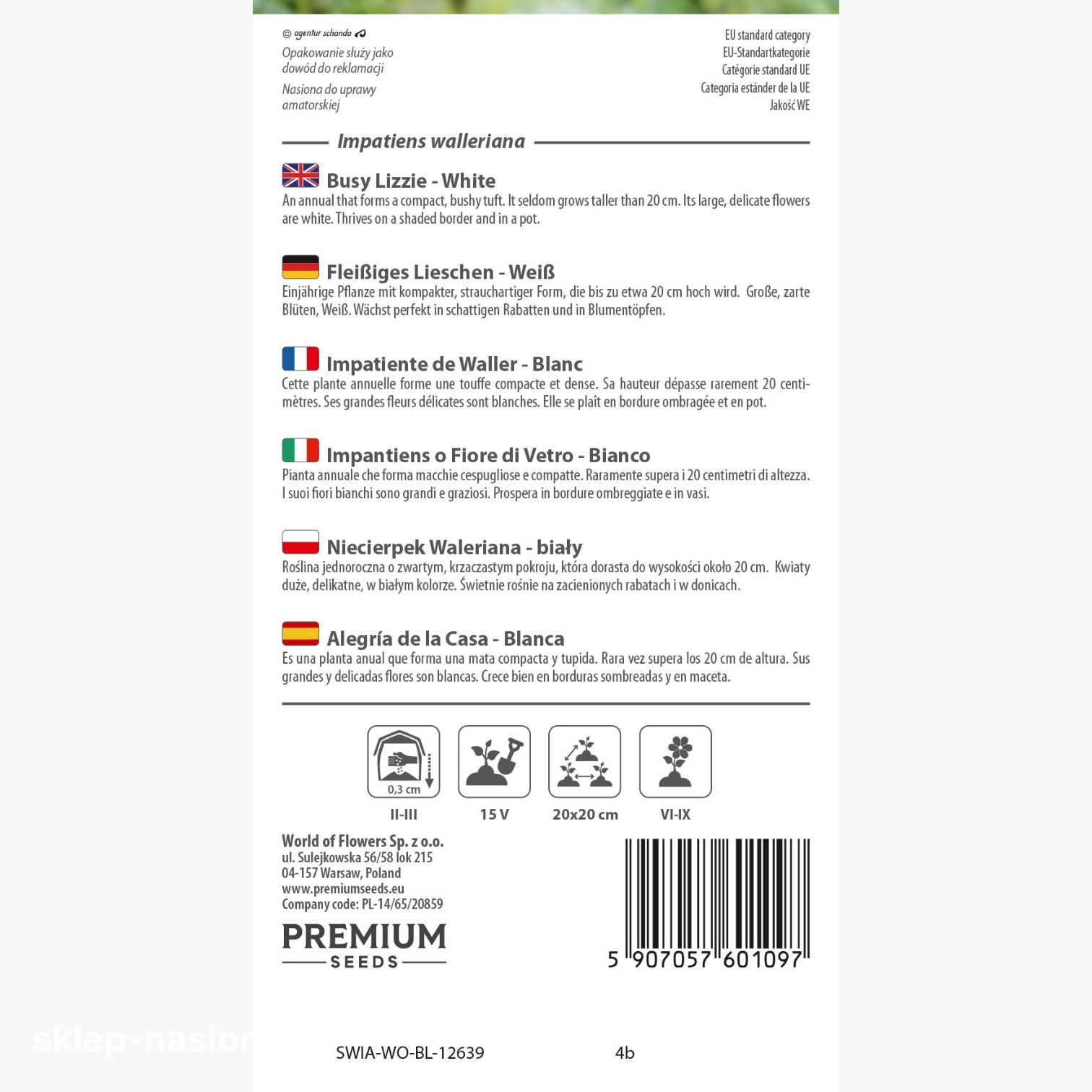 W opakowaniu znajduje się 0,1 g nasion Niecierpka Waleriana - biały. Każde opakowanie zawiera instrukcję uprawy oraz informację o terminie przydatności do siewu.