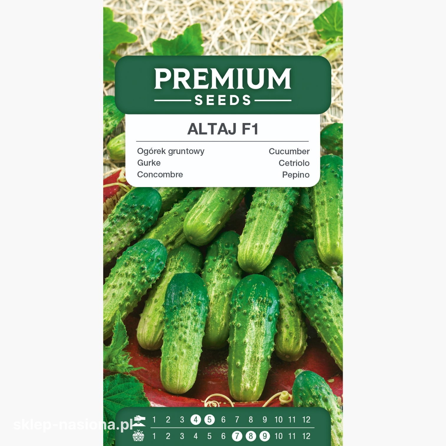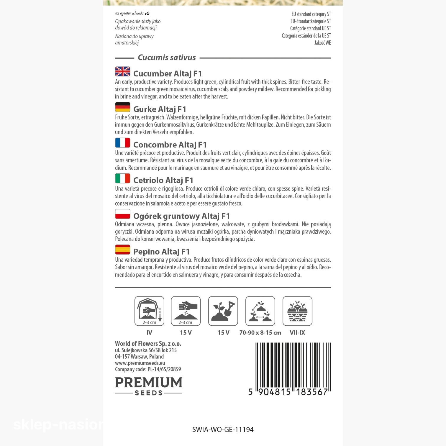 W opakowaniu znajduje się 3 g nasion ogórka Altaj F1, a na etykiecie umieszczone zostały informacje dotyczące uprawy oraz termin przydatności do spożycia.