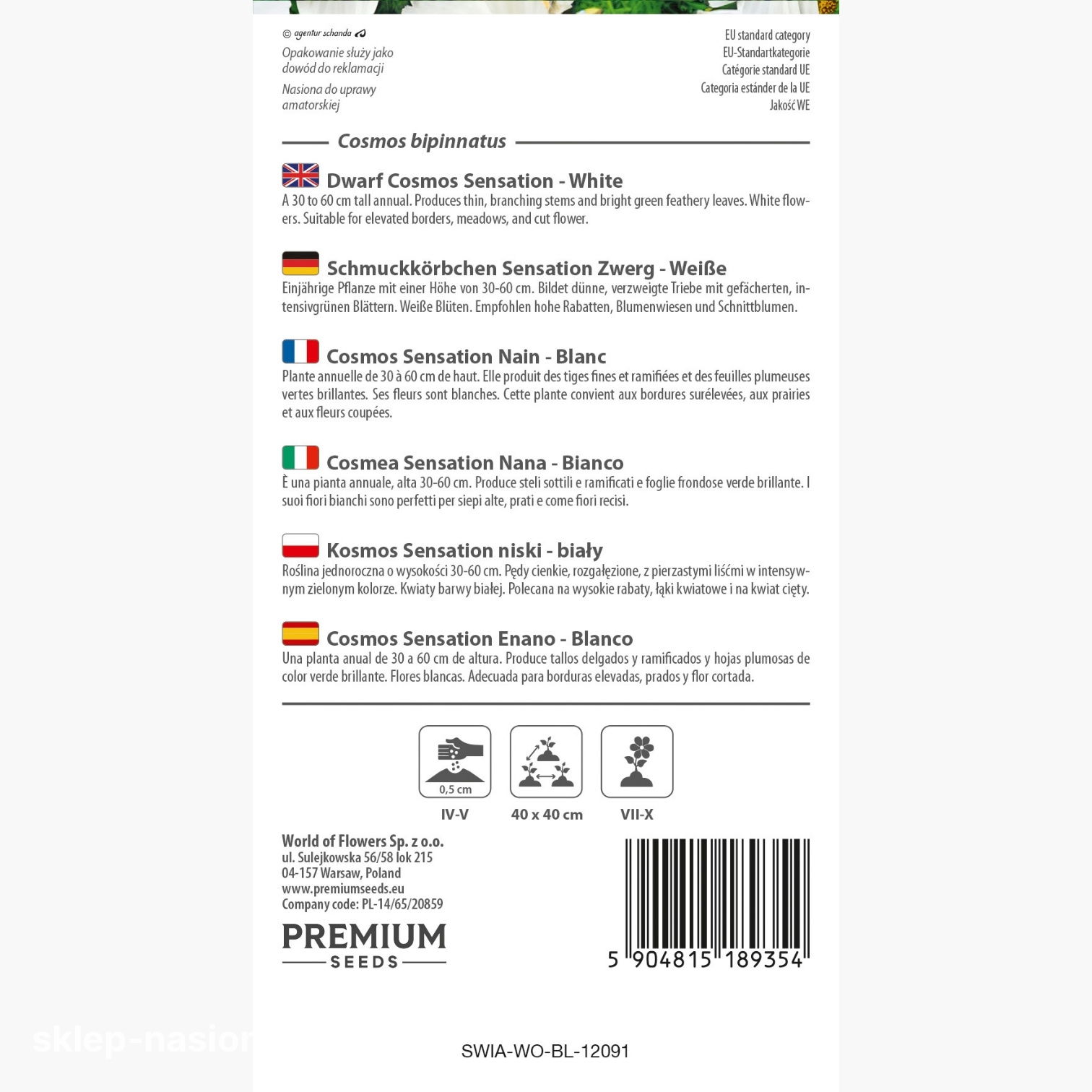 Oferta dotyczy opakowania zawierającego 2 g nasion Kosmosu niskiego Sensation o białych kwiatach. Na tyle paczki zostały zamieszczone podstawowe informacje o roślinie i jej uprawie.
