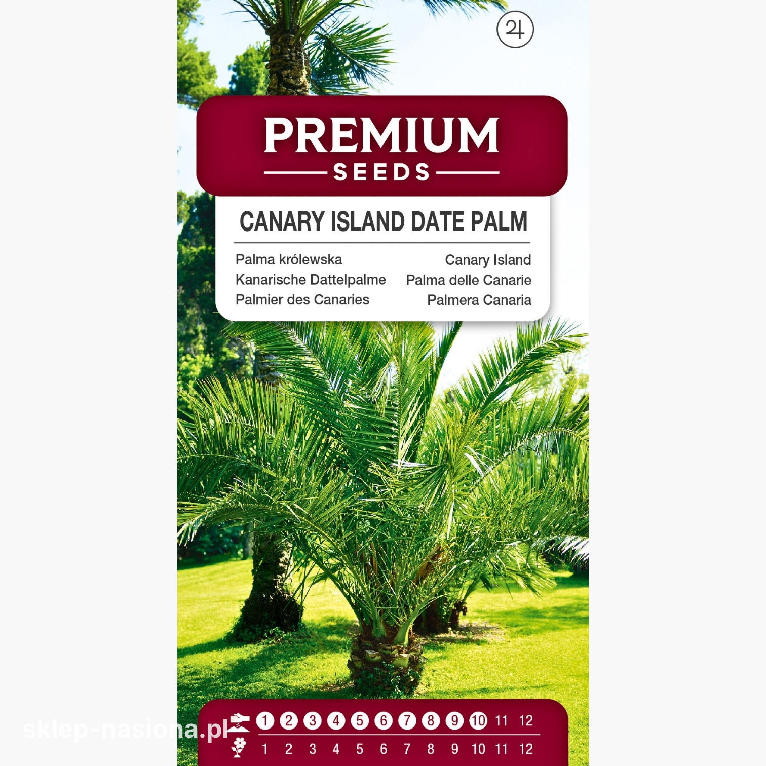 Opis rośliny: Palma królewska, znana również pod mniej arystokratyczną nazwą daktylowca kanaryjskiego, to łatwa w uprawie, odporna i nieprzeciętnie dekoracyjna roślina doniczkowa. Pozyskane z jej nasion siewki rosną bardzo szybko i w krótkim czasie przybierają formę palemki, z charakterystycznym dla tego gatunku grubym pniem i bujną strzechą zielonych liści, zebranych u jego szczytu.