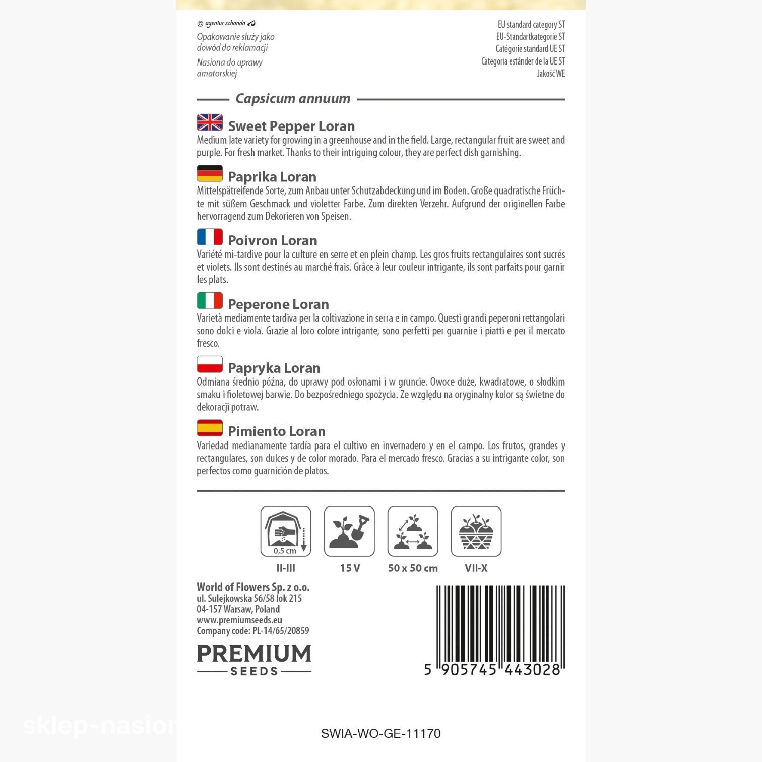 Zastosowanie: z uwagi na kolor papryka Loran jest doskonała do dekorowania półmisków i talerzy. Genialnie prezentuje się w sałatkach i mieszankach warzywnych. Słodka i soczysta papryka to dobry dodatek do kanapek, zapiekanek czy potraw kuchni azjatyckiej. Własne owoce papryki, zerwane prosto z krzaka to bardzo wartościowy składnik codziennej, zbilansowanej, zdrowej diety.