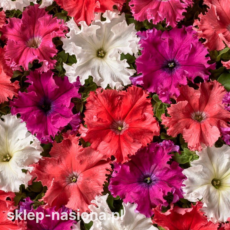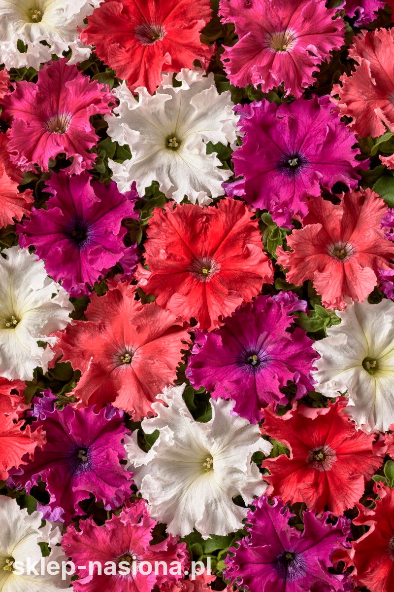 Petunia Aphrodite F1 - Mix to jednoroczna mieszanka o dużych, efektownych kwiatach i ozdobnie pofalowanych, lekko karbowanych płatkach. Rośliny tworzą zwarte kępy z pędami delikatnie przewieszającymi się na boki, dlatego świetnie sprawdzają się w donicach i skrzynkach balkonowych, a różnorodność barw pozwala szybko uzyskać wyrazistą, letnią kompozycję.