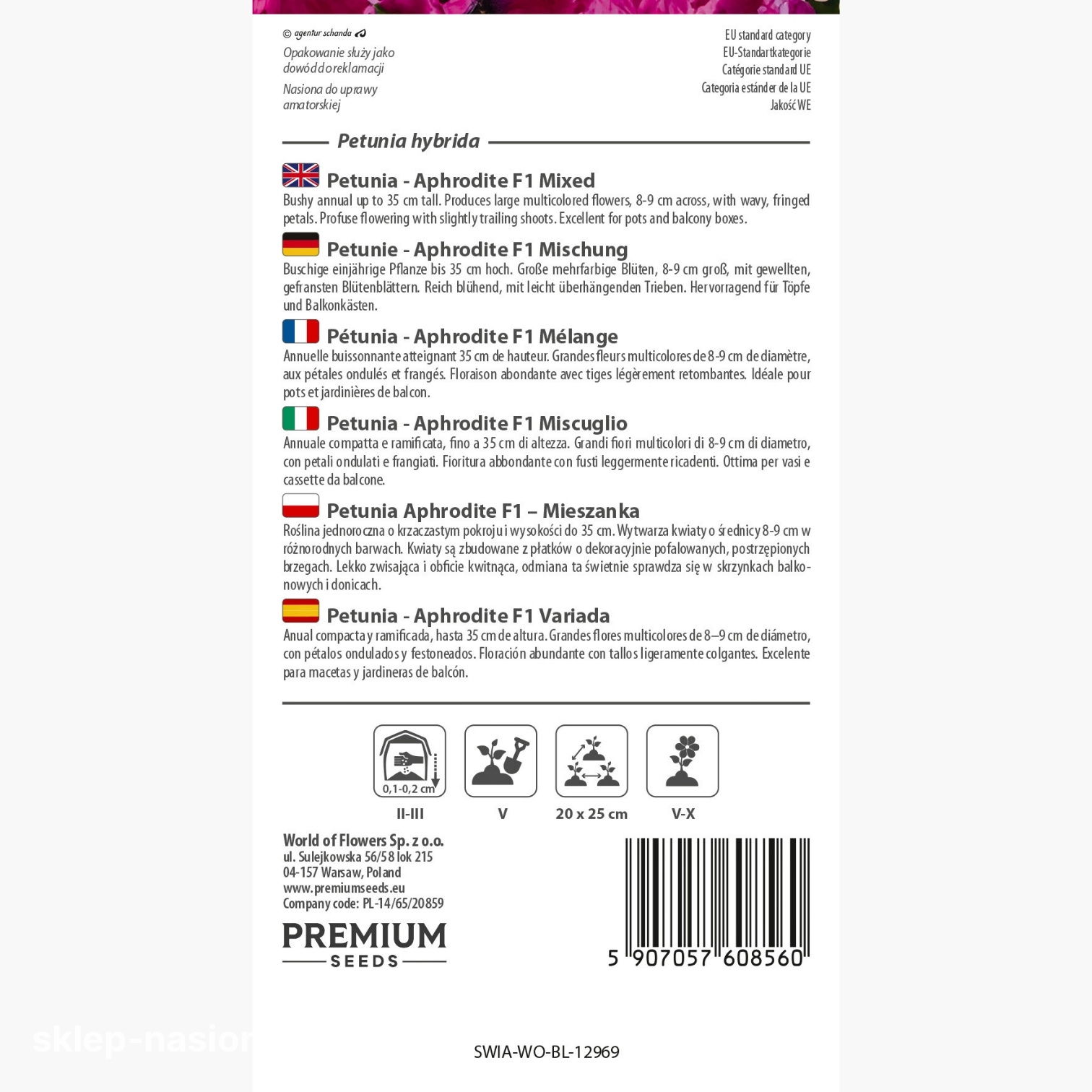 W opakowaniu znajduje się 10 sztuk nasion, z dołączoną informacją o terminie przydatności do siewu i ogólnymi wskazówkami dotyczącymi uprawy.