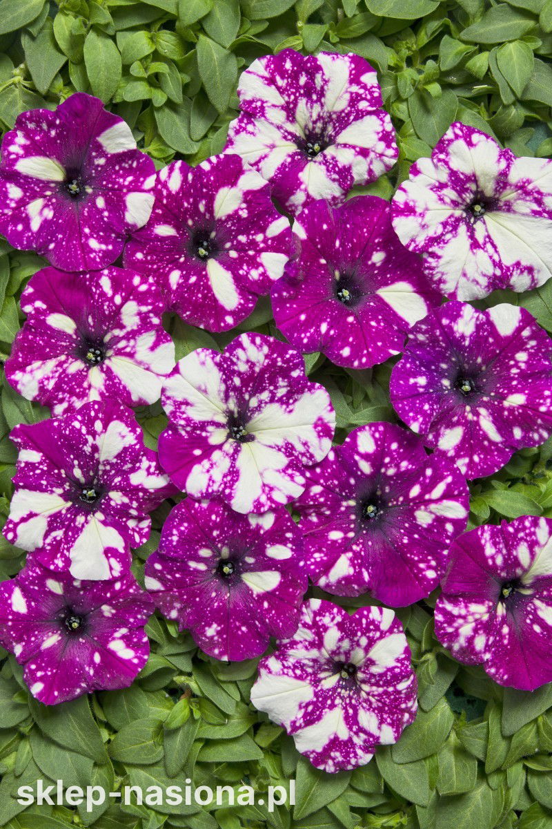 Petunia Dot Star F1 - Dark Violet to jednoroczna petunia o zwartym, gęstym pokroju i długim kwitnieniu. Duże kwiaty w ciemnofioletowym kolorze z białymi plamkami i cętkami efektownie zdobią balkony, tarasy i rabaty, a roślina świetnie sprawdza się w donicach oraz skrzynkach.