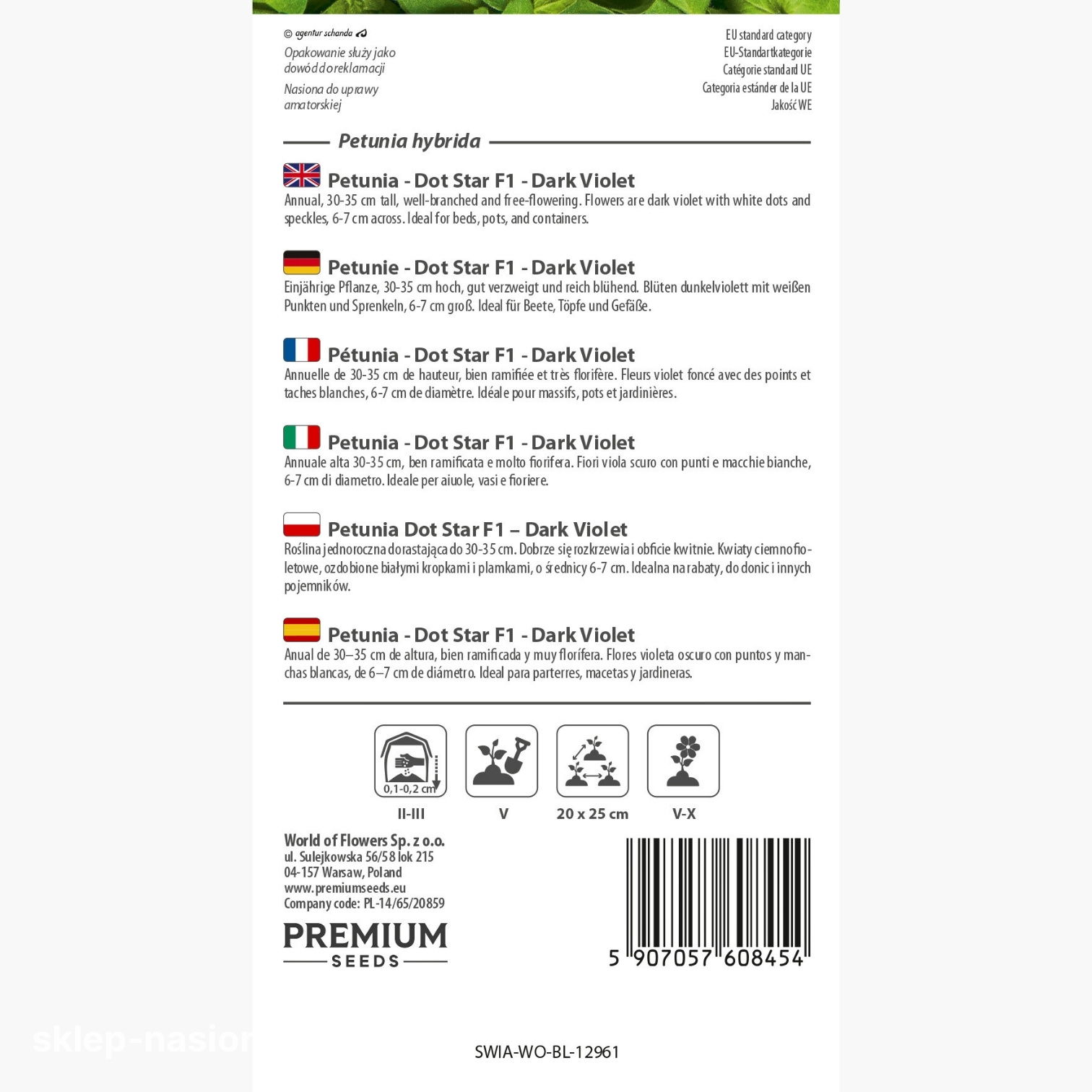W opakowaniu znajduje się 10 nasion petunii Dot Star F1 - Dark Violet. Na opakowaniu znajdują się informacje o terminie przydatności do siewu i podstawowe wskazówki dotyczące uprawy.