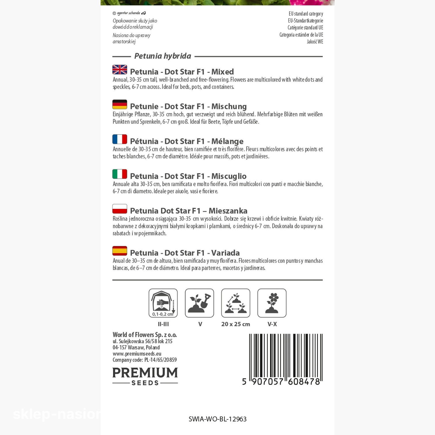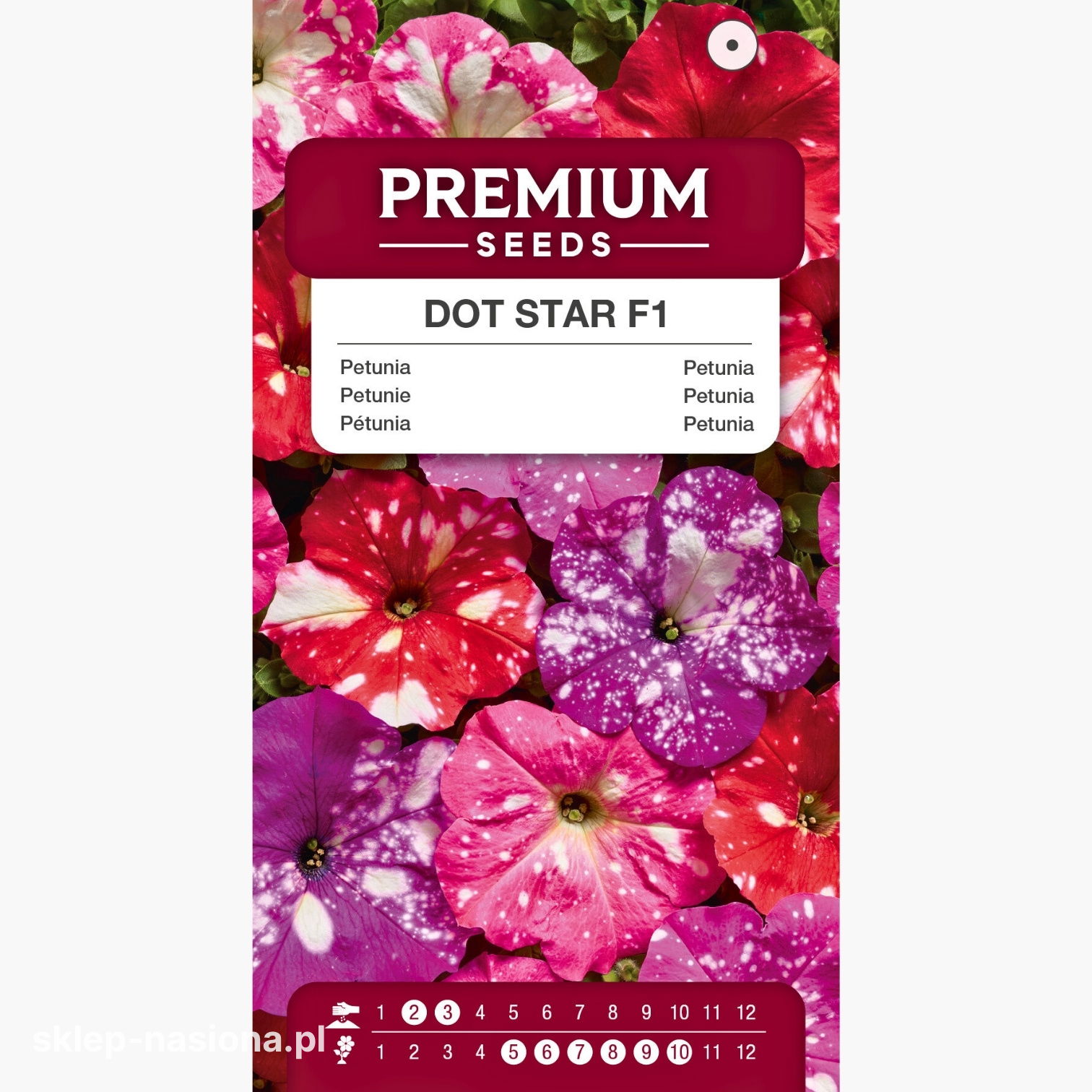 W opakowaniu znajduje się 10 sztuk nasion petunii Dot Star F1 - Mix. Każde opakowanie zawiera informacje o terminie przydatności do siewu oraz ogólne wskazówki dotyczące uprawy.