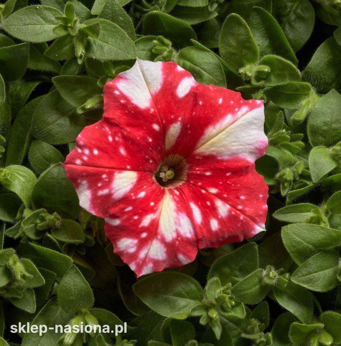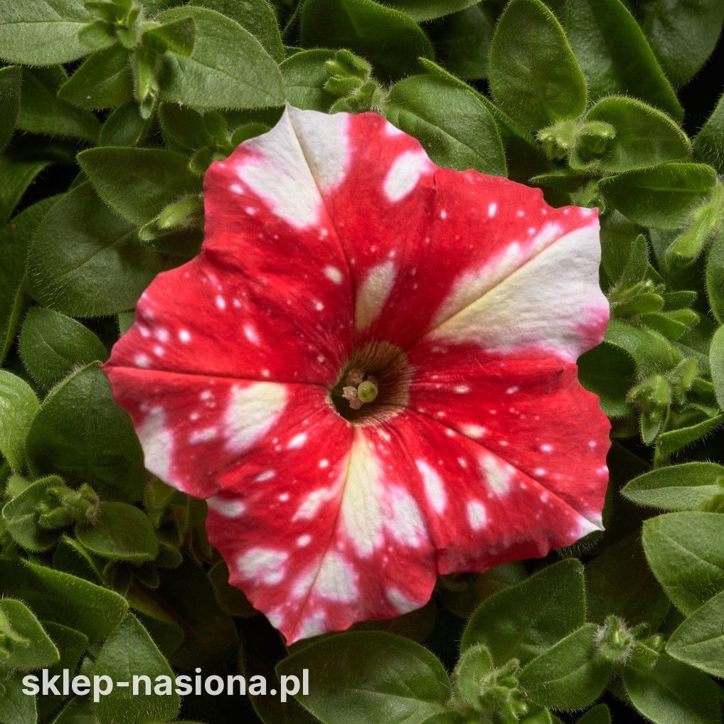 Petunia Dot Star F1 - Red to jednoroczna odmiana o zwartym, dobrze rozgałęzionym pokroju, która szybko wypełnia donice i skrzynki balkonowe. Kwitnie długo i obficie, tworząc duże, pojedyncze kwiaty w czerwonym kolorze z białymi plamkami i drobnymi cętkami, dzięki czemu kompozycje są wyraziste przez cały sezon.