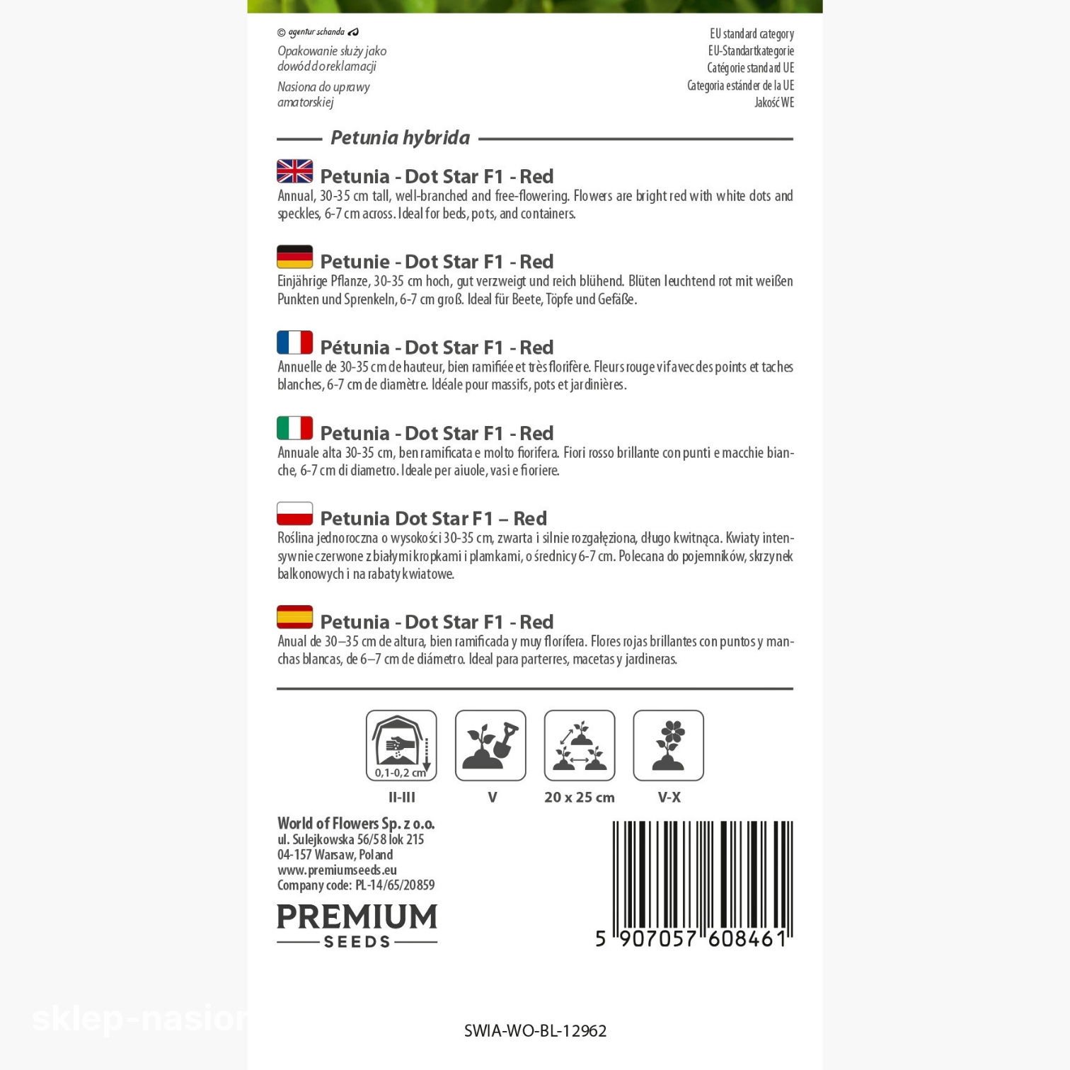 W opakowaniu znajduje się 10 nasion. Na opakowaniu znajdują się informacje o terminie przydatności do siewu i podstawowe wskazówki dotyczące uprawy.