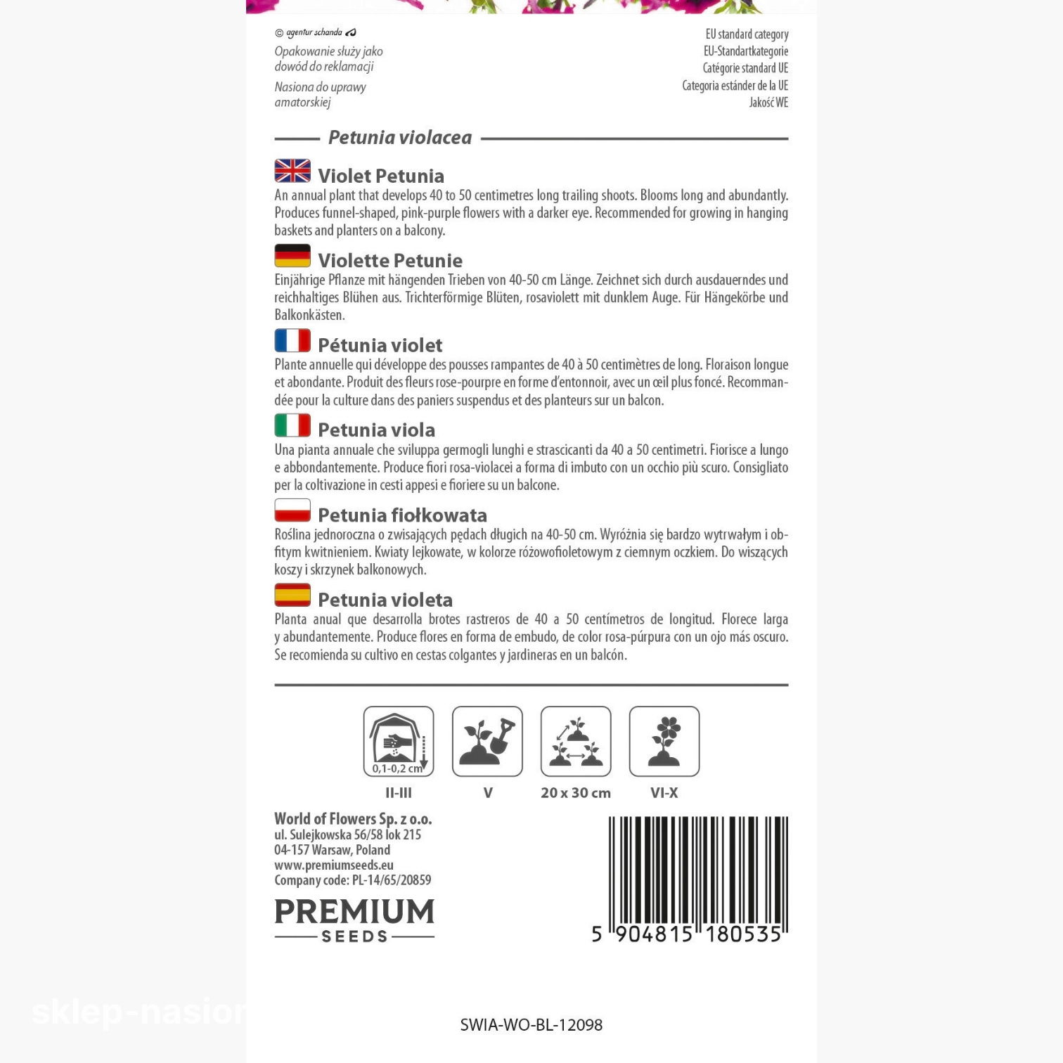 Dostępne w sprzedaży opakowanie zawiera 0,1 g nasion petunii fiołkowatej.