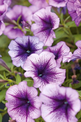 Petunia ogrodowa Tęcza to odmiana o wyjątkowym wybarwieniu kwiatów. Okazałe kwiaty mają śliczny fioletowy kolor z wyraźnie ciemniejszym rysunkiem, rozchodzącym się promieniście od środka ku brzegom kielicha. Rośliny pięknie prezentują się posadzone w skrzynkach, misach oraz podwieszanych doniczkach.