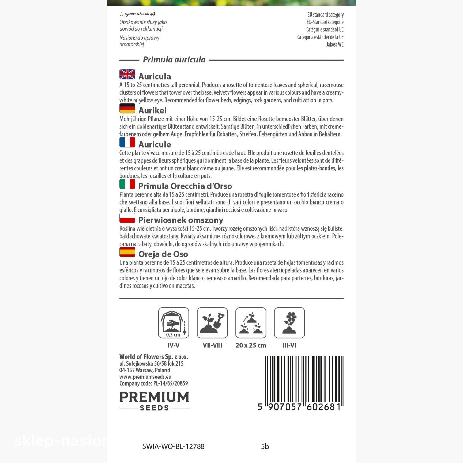 Opakowanie zawiera 0,1 g nasion. Na jego tyle zamieszczono wskazówki dotyczące sposobu uprawy i pielęgnacji pierwiosnka oraz informację o terminie przydatności do siewu. Nasiona dostępne w sprzedaży w naszym sklepie internetowym charakteryzują się wysoką jakością.