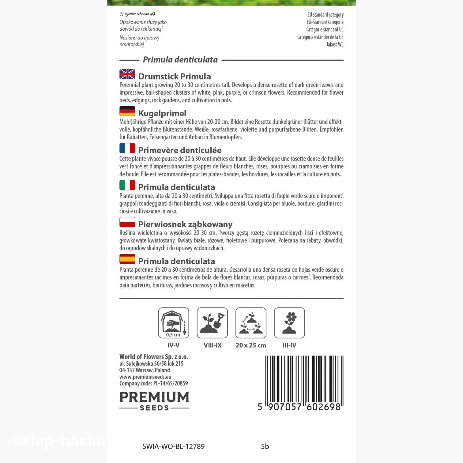 Opakowanie zawiera 0,03 g nasion. Na jego tyle zamieszczono wskazówki dotyczące sposobu uprawy i pielęgnacji pierwiosnka ząbkowanego oraz informację o terminie przydatności do siewu. Nasiona dostępne w sprzedaży w naszym sklepie internetowym charakteryzują się wysoką jakością.