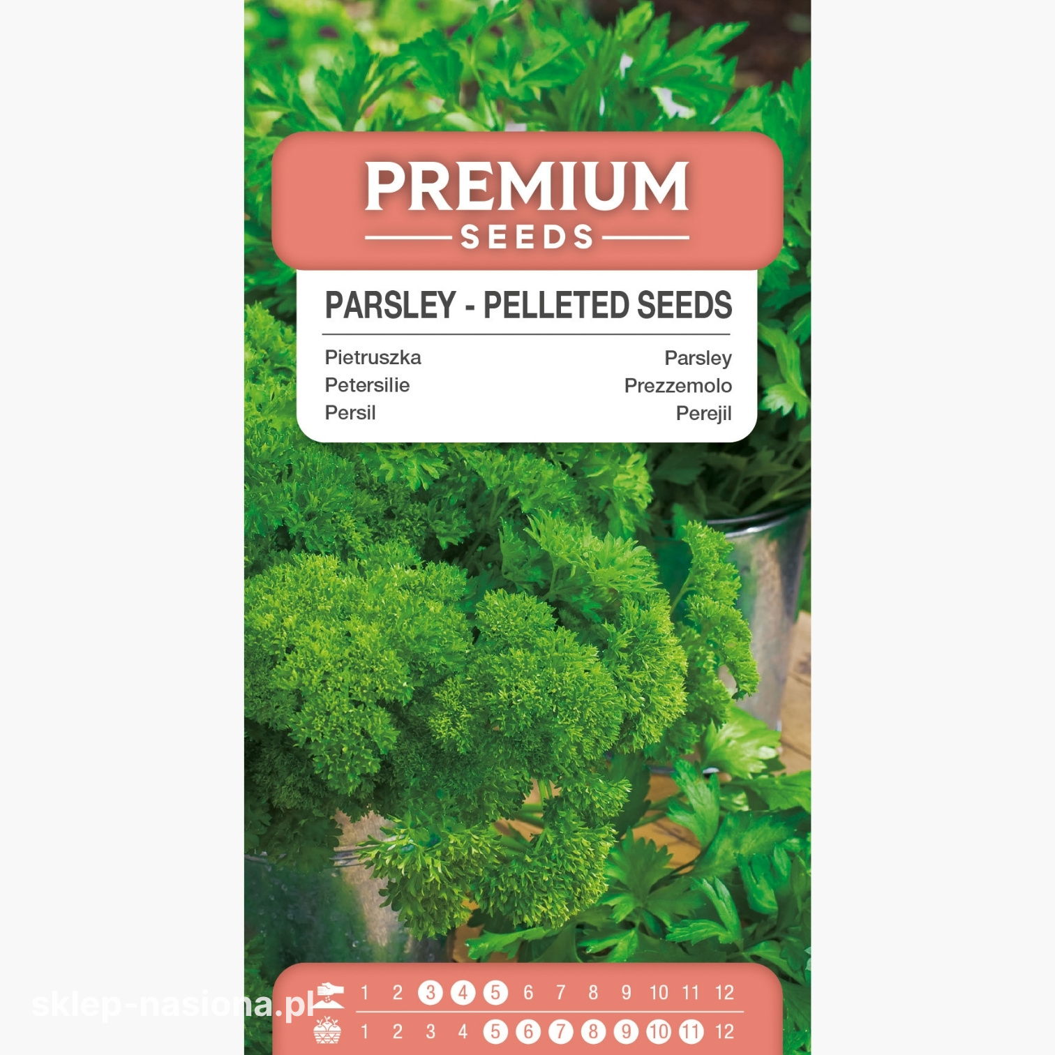 Opakowanie zawiera: Około 300 sztuk nasion otoczkowanych mieszanki odmian pietruszki naciowej, informacje pomagające w uprawie oraz termin przydatności do wysiewu.