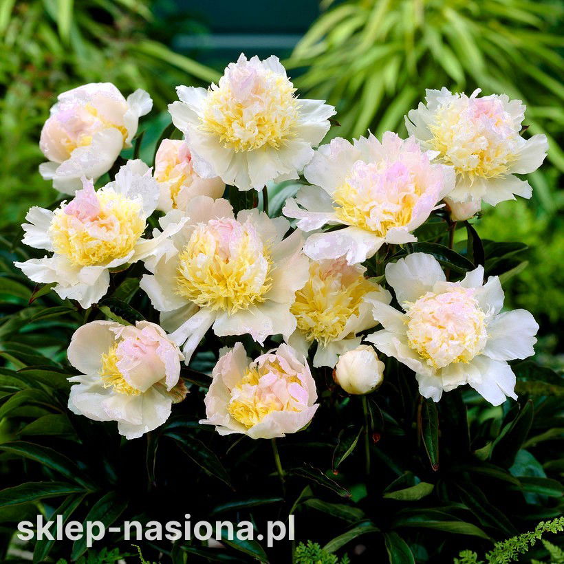 Piwonie to jedne z najpiękniejszych kwiatów ogrodowych, chętnie uprawianych na kwiat cięty. Paeonia Top Brass to jedna z niezwykle atrakcyjnych odmian, która wyróżnia się ciekawą barwą kwiatów. Kremowo- żółte pompony w centralnej części zdobi kilka zabarwionych na różowo płatków. Kwiaty tej odmiany mają przyjemny zapach.