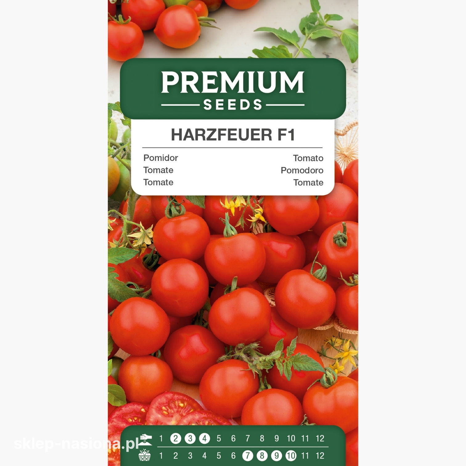 W każdym opakowaniu znajduje się 0,2 g nasion pomidora Pomidor Harzfeuer F1. Opakowanie zawiera informacje o zasadach uprawy oraz o terminie przydatności nasion do siewu.