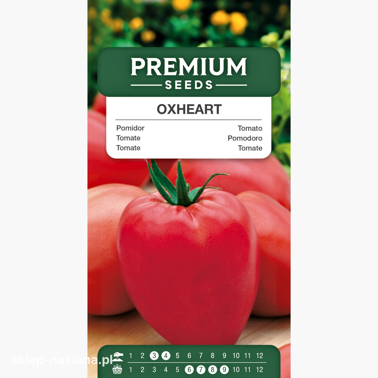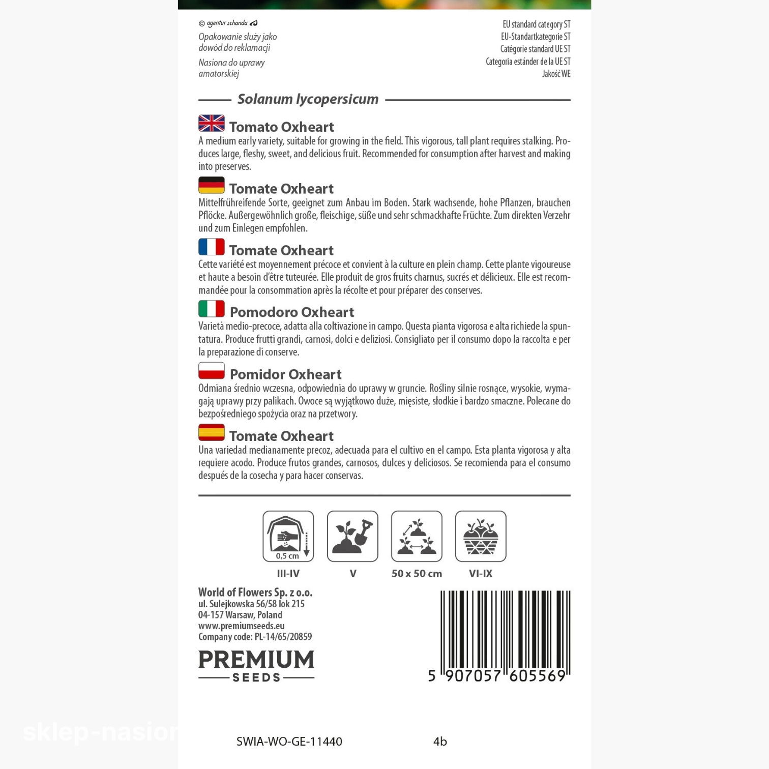 W opakowaniu znajduje się 0,2 g nasion pomidora Oxheart. Każde opakowanie zawiera oznaczenie terminu przydatności do siewu i szczegółowe wskazówki dotyczące uprawy.