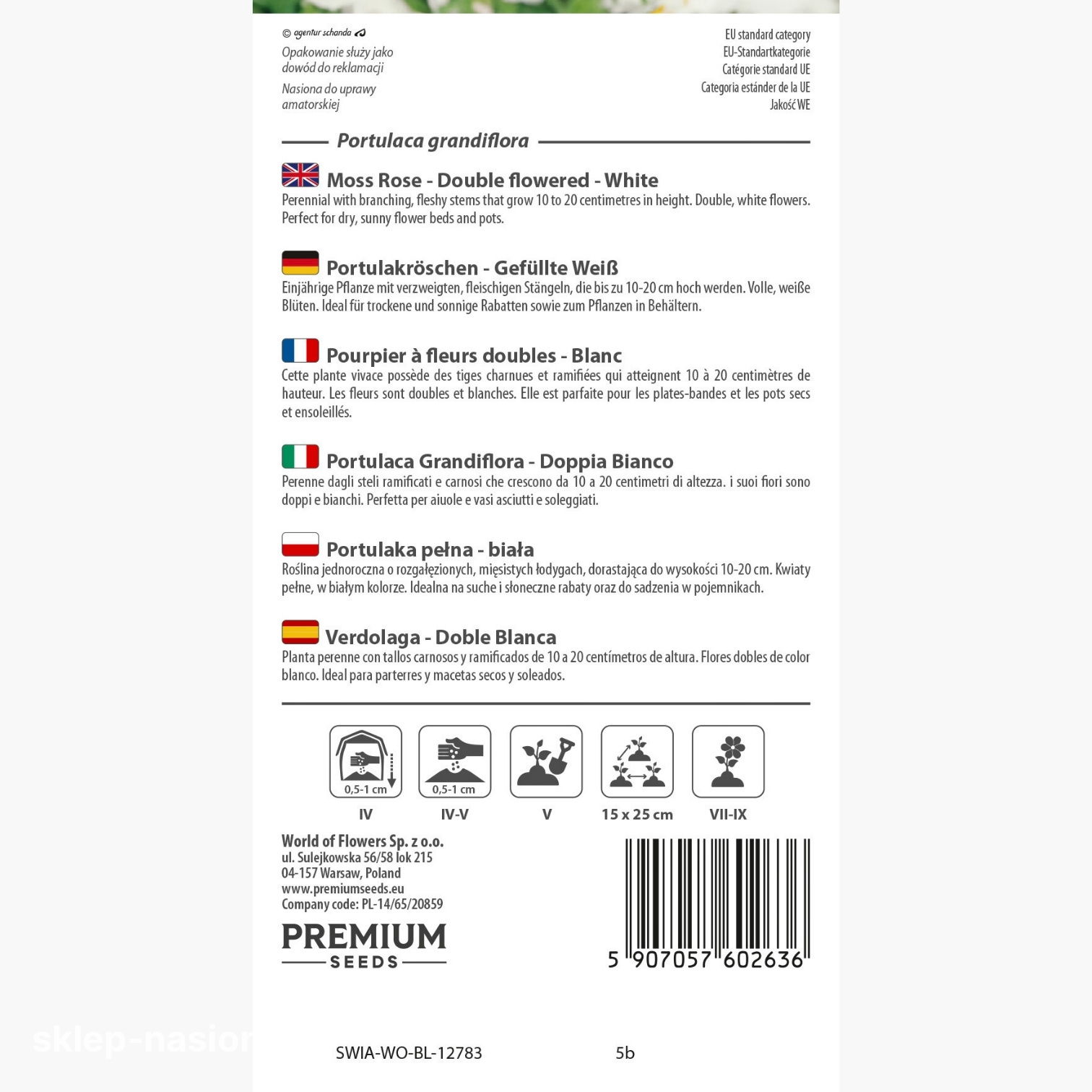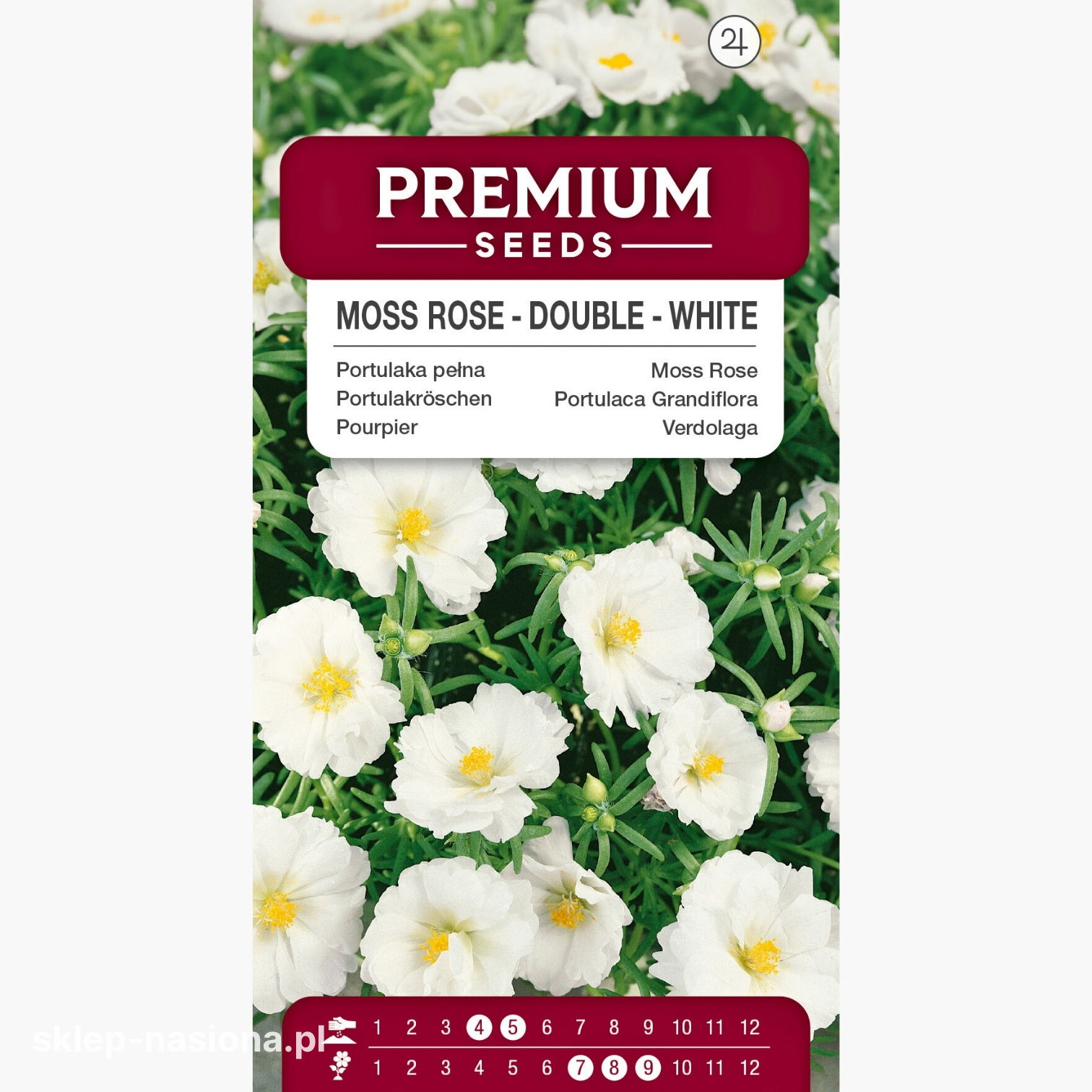 W opakowaniu znajduje się 0,2 g nasion portulaki pełnej - białej. Każde opakowanie ze sklep-nasiona zawiera informacje o terminie przydatności do siewu oraz praktyczne wskazówki uprawowe.