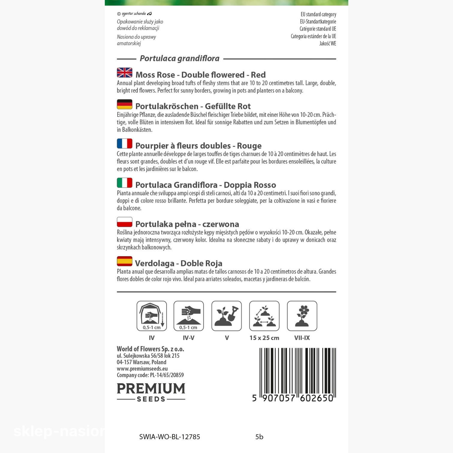 W opakowaniu znajduje się 0,2 g nasion portulaki pełnej - czerwonej. Każde opakowanie zawiera informacje o terminie przydatności do siewu oraz praktyczne wskazówki dotyczące uprawy.