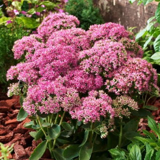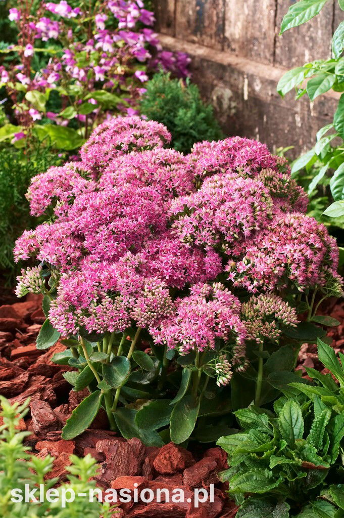 Rozchodnik Carl (Sedum spectabile) to odmiana utrzymana w klasycznej kolorystyce, cechująca się wyjątkowo obfitym kwitnieniem i rzadko widywaną siłą wzrostu. Jej pędy sięgają po 50 cm długości. W okresie od sierpnia do października zwieńczone są rozłożystymi, gęstymi, efektownymi baldachami kwiatowymi. Na każdy kwiatostan składają się setki gwiazdkowatych kwiatów w prześlicznym, intensywnie różowym kolorze. Rozchodnik jest rośliną miododajną, dostarcza więc bezcennego pożywienia owadom zapylającym w sezonie, gdy kwiatów jest coraz mniej. Na uwagę zasługuje także ulistnienie tej wspaniałej byliny. Jej mięsiste, okazałe, szarozielone liście mają owalny kształt i dekoracyjnie ząbkowane brzegi.