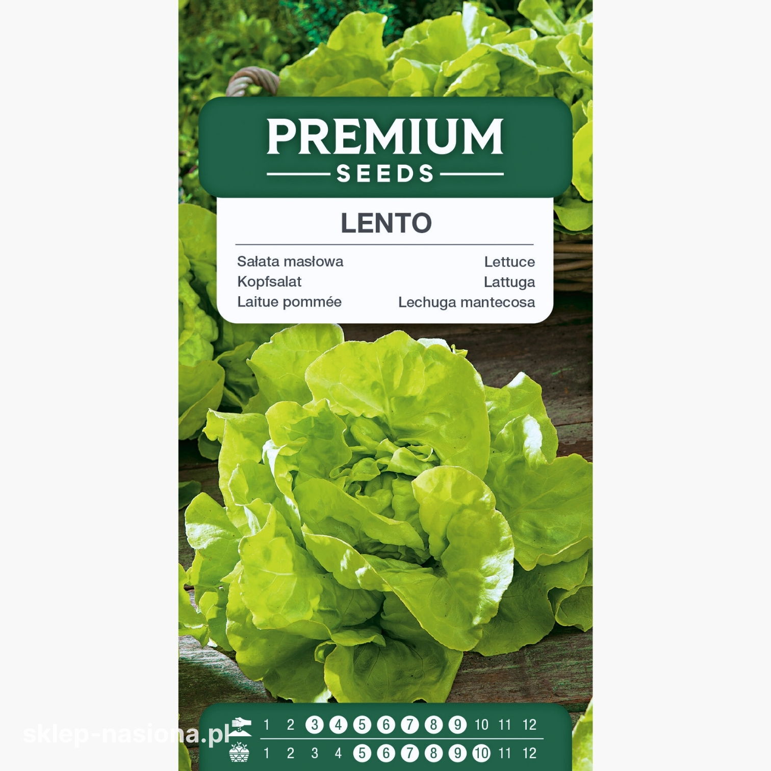 Opakowanie zawiera 1 g nasion sałaty Lento, datę przydatności do siewu i zasady uprawy.
