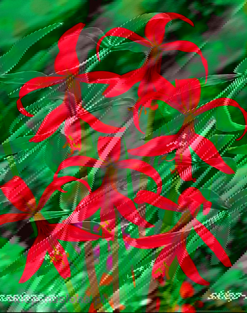 Rodzaj kwiatów: Sześć długich, wąskich, wywiniętych ozdobnie płatków tworzy intrygujący kwiatostan: trzy górne są wzniesione niemal pionowo, a trzy dolne skierowane do przodu, zrośnięte u nasady w wąski lejek.