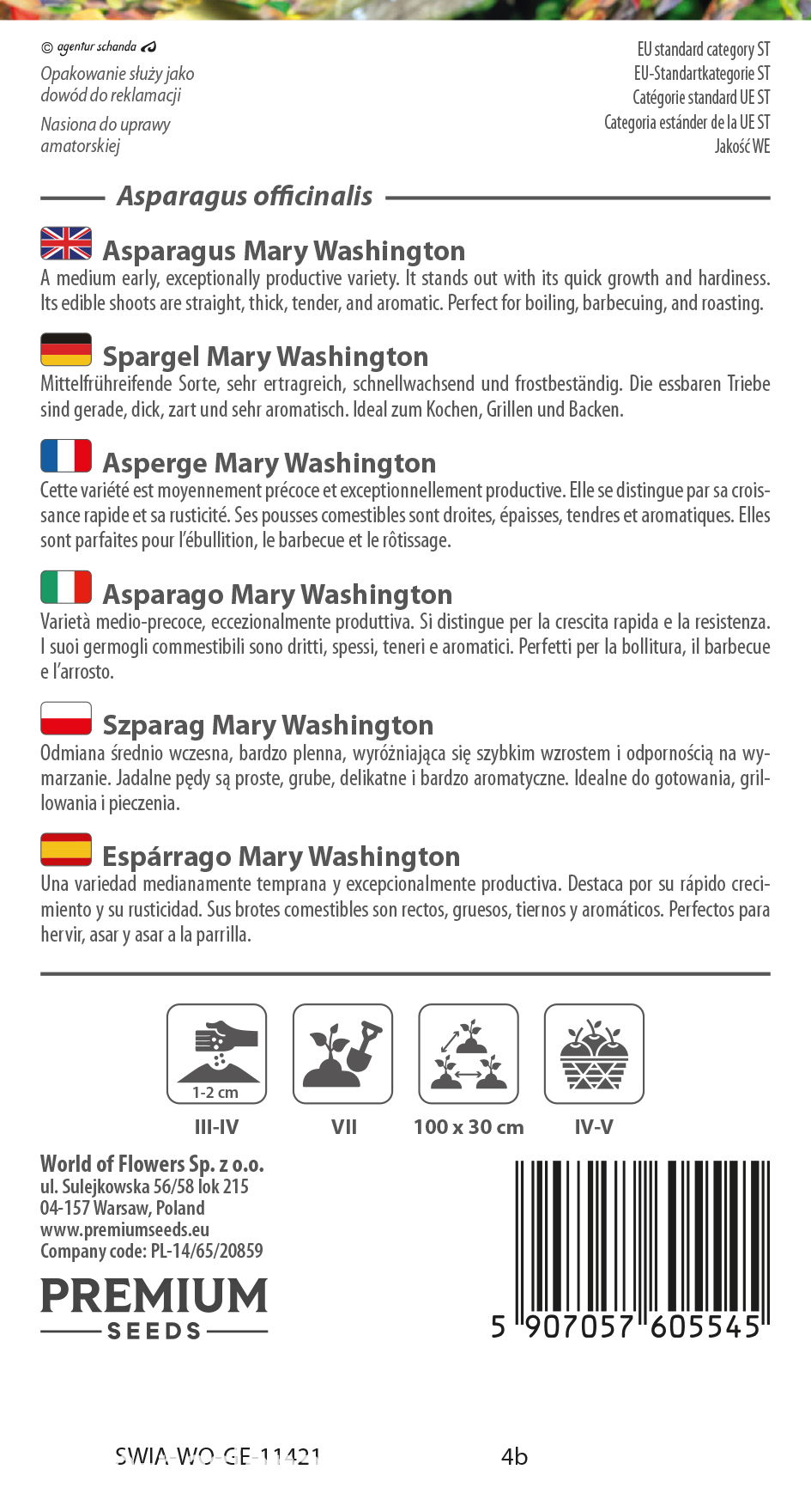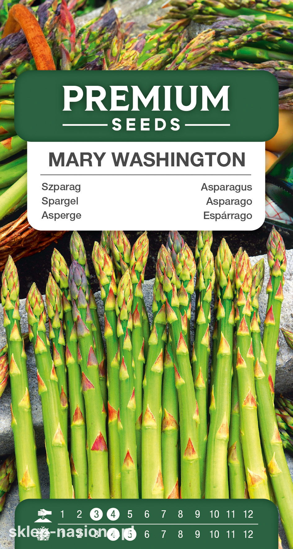 Termin wysiewu: Nasiona szparaga Mary Washington zaleca się wysiewać do inspektu lub na rozsadniku począwszy od marca do końca maja. Nasiona przed wysiewem należy moczyć w wodzie przez okres 3-5 dni co znacznie skróci czas kiełkowania.