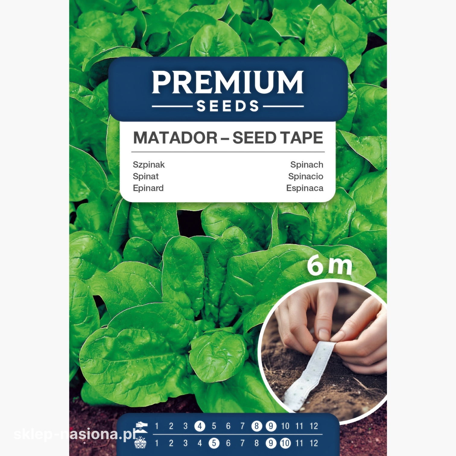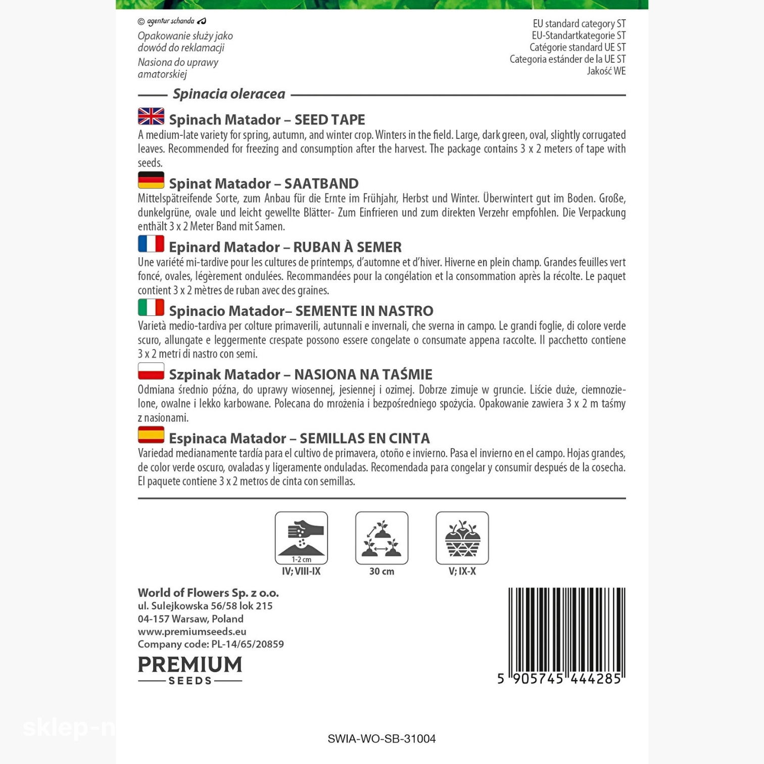 W opakowaniu znajduje się 6 metrów taśmy z nasionami Szpinaku Matador. Na odwrocie opakowania znajdują się wskazówki uprawowe i termin użyteczności siewnej.