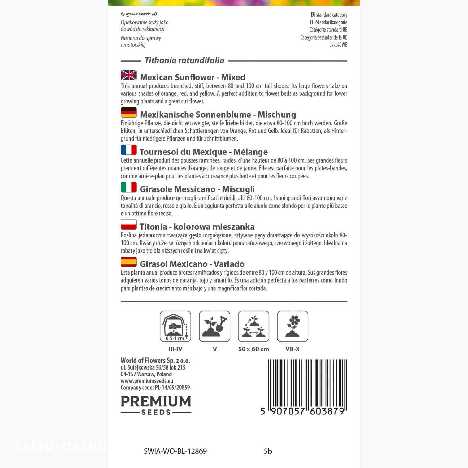 W opakowaniu znajduje się 0,5 g nasion Titonii - kolorowej mieszanki. Każde opakowanie zawiera aktualny termin przydatności do siewu oraz praktyczne informacje uprawowe.