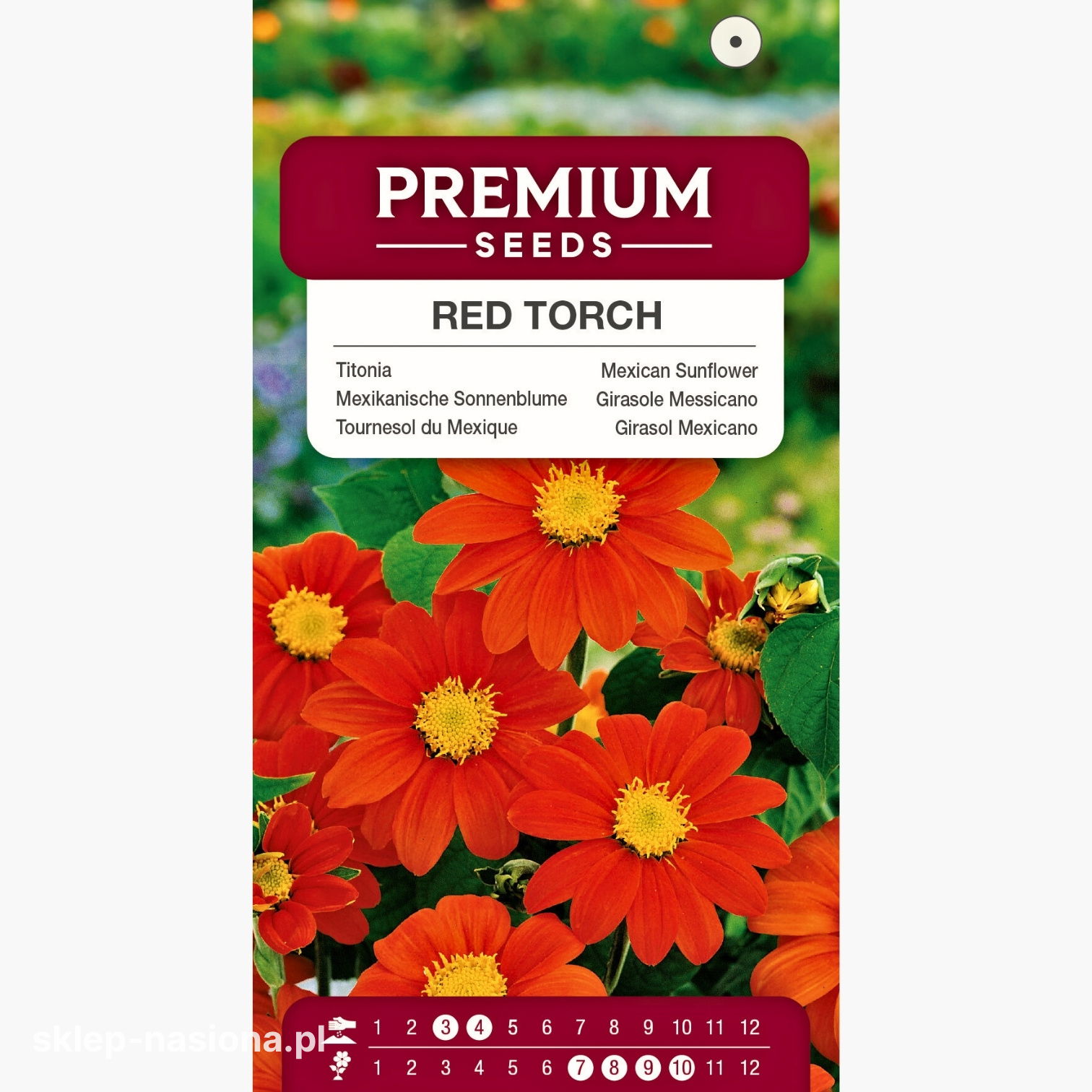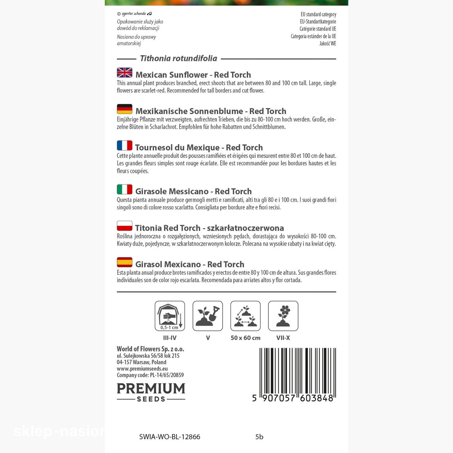W opakowaniu znajduje się 0,5 g nasion Titonii Red Torch. Każde opakowanie zawiera aktualny termin przydatności do siewu oraz praktyczne wskazówki uprawowe.