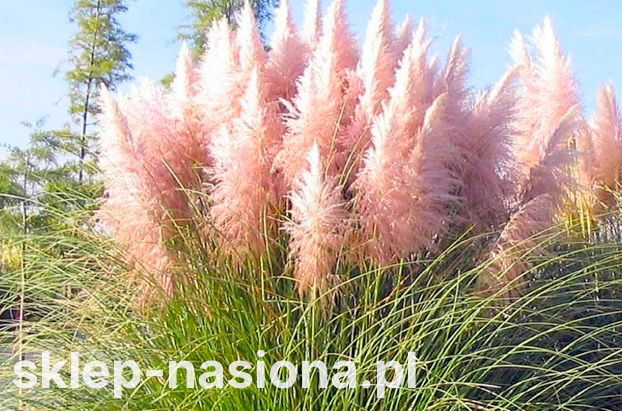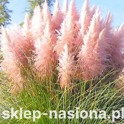 Zastosowanie: Kortaderia pampasowa różowa znakomicie sprawdzi się w kompozycjach z bylinami kwitnącymi wczesną jesienią, takimi jak rudbekia, jeżówka czy różowy rdest pokrewny. Towarzystwo innych traw, np. miskanta chińskiego o pręgowanych liściach, dodatkowo podkreśli urok jej kwiatów. Ze względu na duże rozmiary trawa pampasowa jest polecana do roli solitera, tła rabaty oraz do obsadzania zbiorników wodnych. Jej kwitnące pędy warto ścinać na suche bukiety.