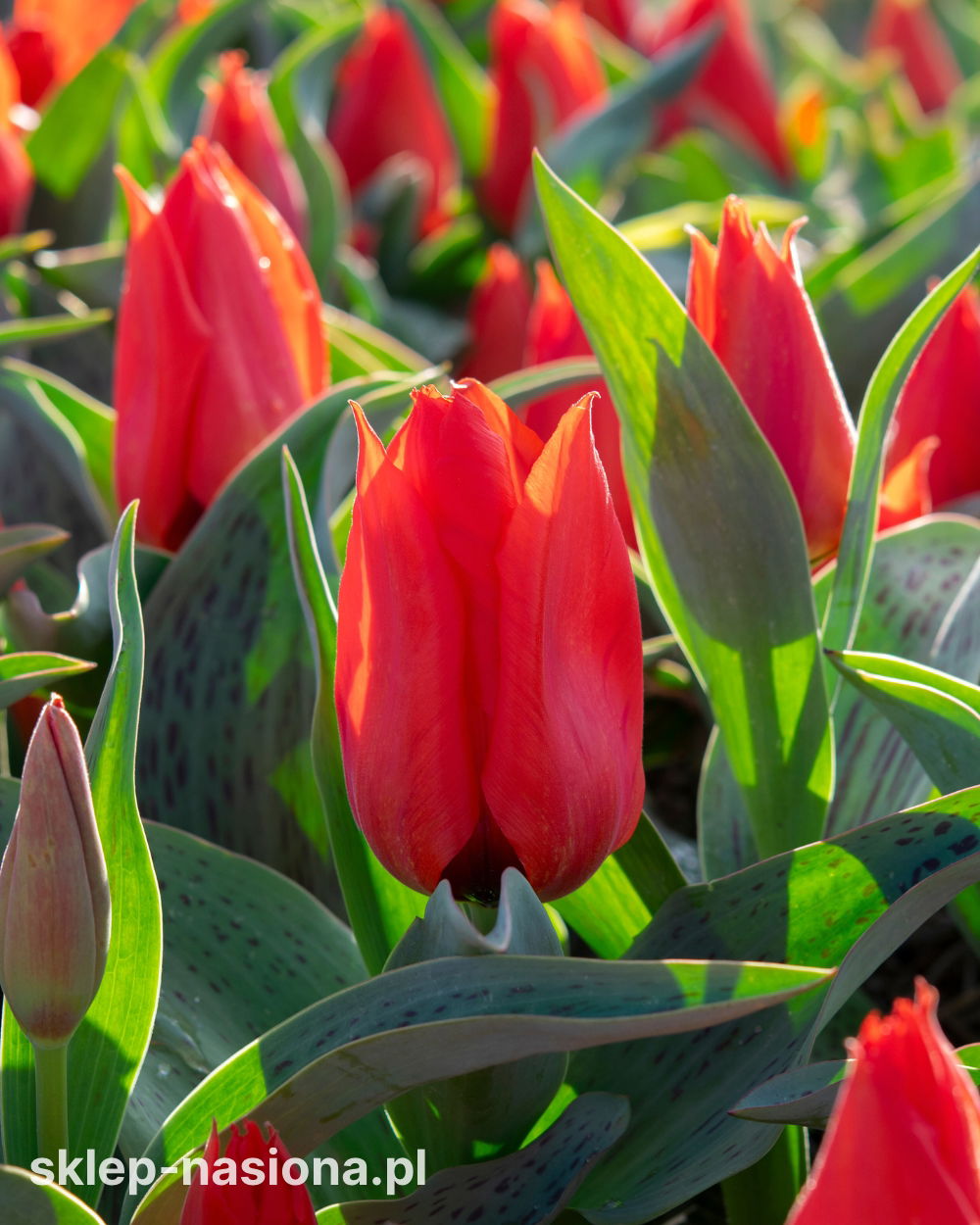Jeśli szukasz tulipana, który zachwyca kolorem, ale nie zdominuje kompozycji – 'Annie Salomons' będzie strzałem w dziesiątkę. Ta niska, ale wyjątkowo dekoracyjna odmiana z grupy Greigii łączy intensywną czerwień kwiatów z ozdobnymi liśćmi, tworząc niewielkie, lecz bardzo efektowne akcenty wiosenne. Kwiaty otwierają się szeroko w słoneczne dni, przyciągając wzrok naturalną gracją i świeżością.