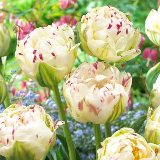 Tulipan Danceline posiada niewiarygodnie obfite, pełne kwiatostany o płatkach w aż trzech kolorach. Ich czysta, śnieżna biel, naznaczona soczystą zielenią i mocnymi różowymi akcentami, to naprawdę wspaniały widok. Duże, peoniowe tulipany oferowanej w naszym sklepie odmiany stanowią zachwycającą dekorację frontu rabaty. Świetne także jako kwiat cięty, bardzo długo zachowują nienaganny, świeży wygląd i spodobają się najbardziej wymagającym działkowcom.