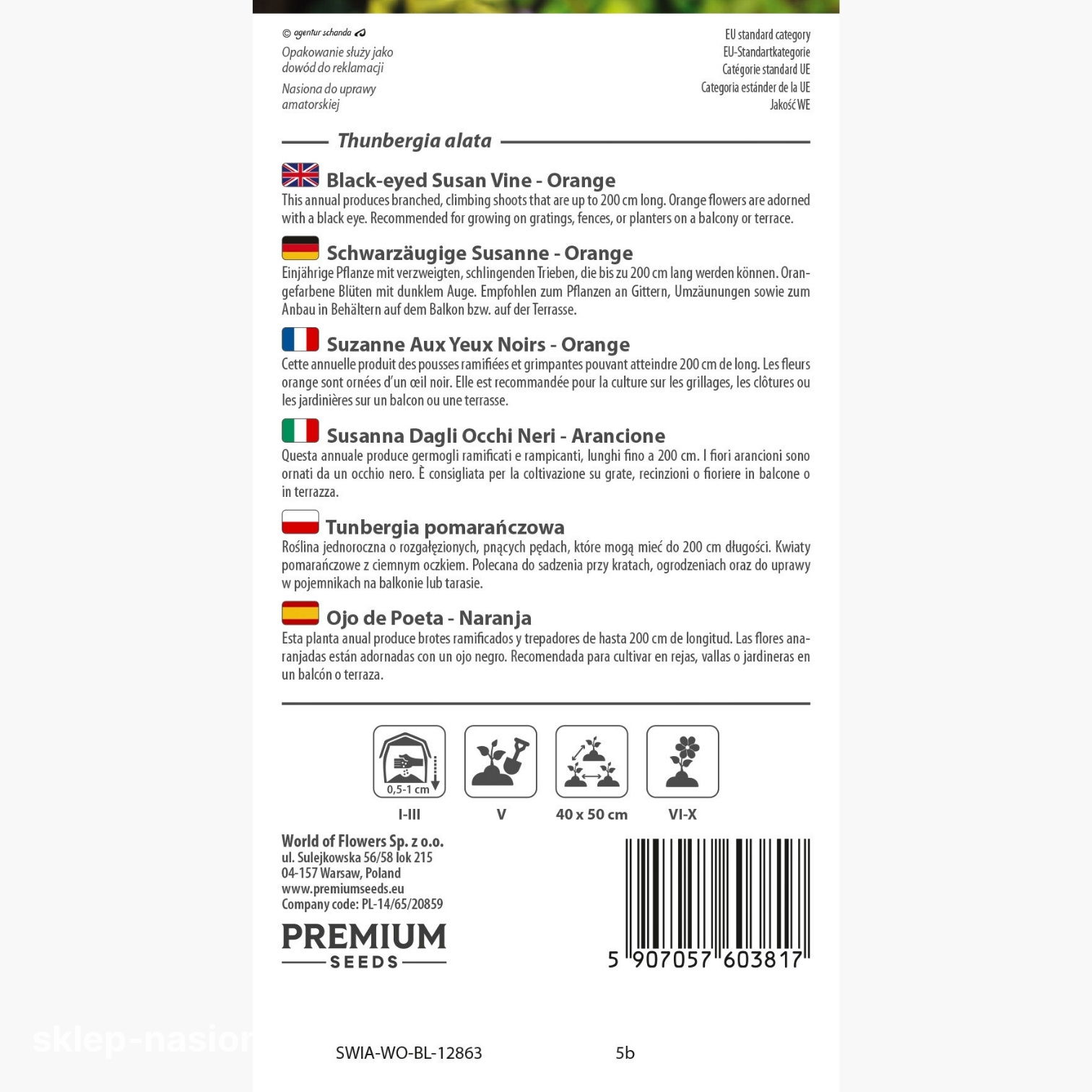 Nasz sklep oferuje sprzedaż nasion tunbergii pomarańczowej w opakowaniach o gramaturze 0,5 g. Na każdej paczce znajdują się porady na temat uprawy roślin oraz informacje dotyczące okresu przydatności ich nasion do siewu.