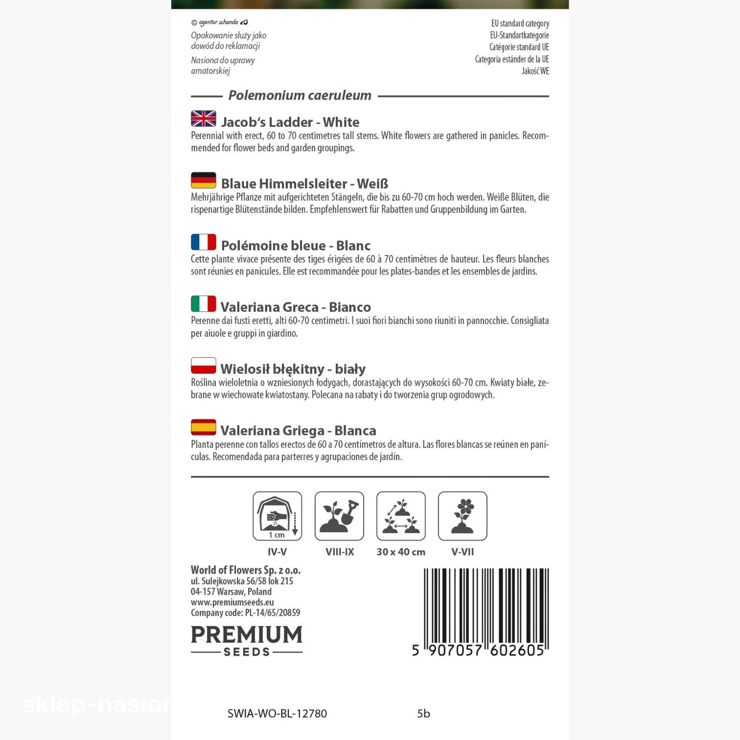 W opakowaniu znajduje się 0,5 g nasion wielosiłu błękitnego białego. Każde opakowanie zawiera informacje o terminie przydatności do siewu oraz praktyczne wskazówki dotyczące uprawy.