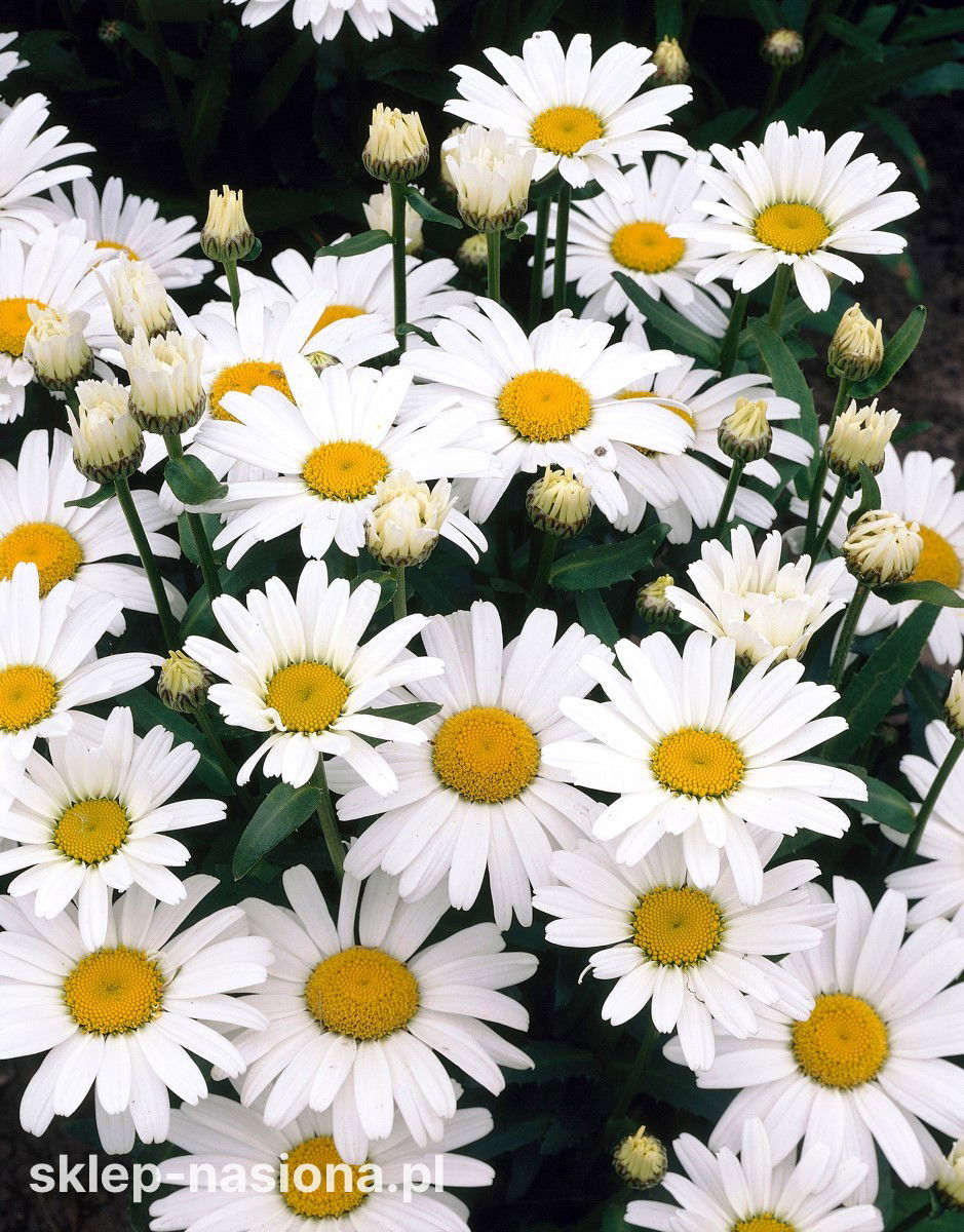 Rodzaj i kolor kwiatów: Kwiaty pojedyncze, osadzone na sztywnych pędach, o śnieżnobiałych, prostych płatkach i intensywnie żółtym środku – przypominają klasyczne margerytki, ale są większe i bardziej trwałe.